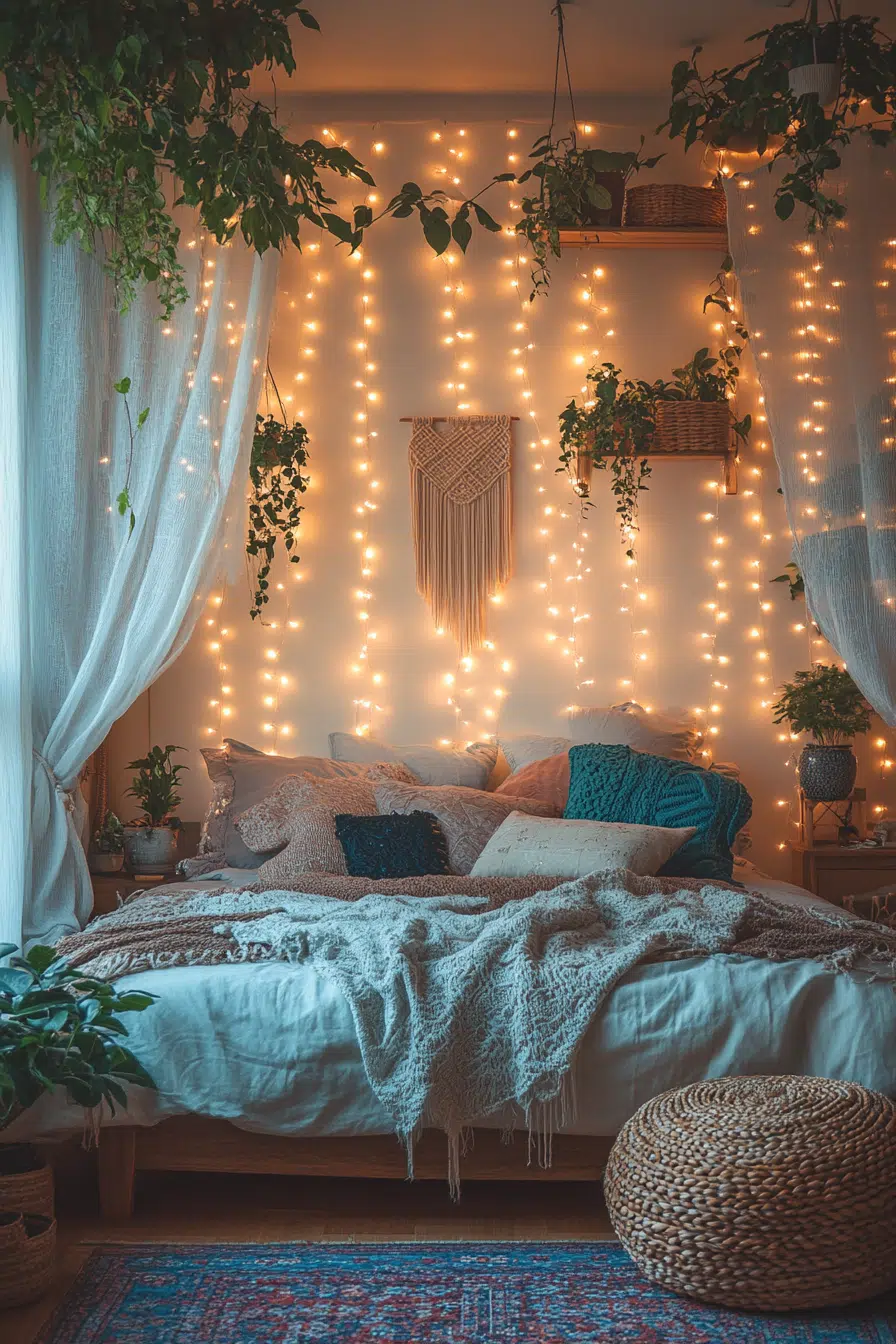 Design a peaceful boho bedroom with curtain lights that create gentle sparkle and calm. Create serenity with simple string lights and affordable neutral decor from discount stores. Add tranquility with DIY light arrangements and budget-friendly natural elements that shine softly.