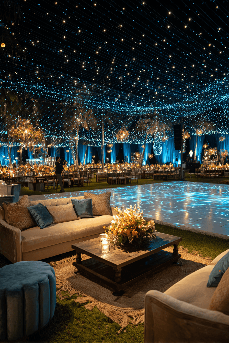 A sky full of stars sets the tone for a boho wedding that feels magical and unforgettable. Deep tones and glowing lights create a dreamy nighttime atmosphere. A central gathering space draws everyone together. Celestial details add personality and wonder. The entire scene feels immersive and unique. Plan your starry boho wedding and make it shine.