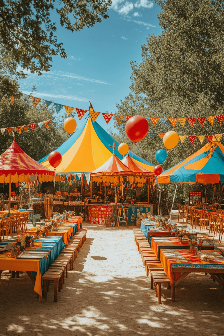 Colorful tents and lively details turn a boho wedding into a vibrant festival experience. A central stage anchors the celebration. Guests gather in relaxed seating areas across the space. The layout feels energetic yet thoughtfully organized. Every detail adds excitement and personality. Create your festival-style boho wedding and go all in.