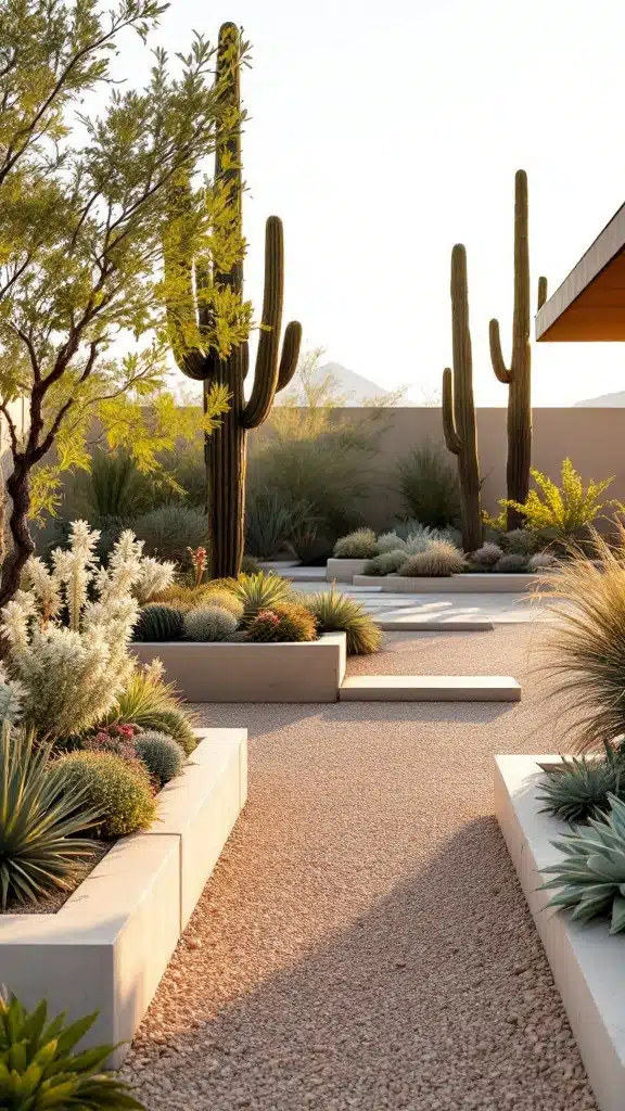 Cactus and Stone Harmony brings the tranquil beauty of the desert to life with a seamless blend of sprawling stones and striking architectural cacti and agaves. A golden-toned gravel base provides a sunlit warmth, perfectly paired with raised beds featuring clean, geometric lines. This earthy palette and symmetry radiate modern elegance while evoking the rugged charm of California’s arid landscapes. Ideal for desert-inspired homes, this timeless setup is low-maintenance yet effortlessly stylish, fusing natural textures with contemporary design finesse.