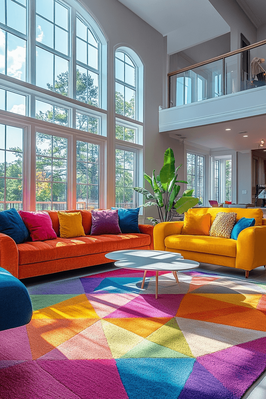 Radiant layering brings colorful living room ideas to life with bold hues that instantly energize your space. Bright tones across decor and furniture create a cheerful, inviting vibe. Neutral foundations keep everything visually balanced. The room feels lively without being overwhelming. Every detail contributes to a feel-good atmosphere. Refresh your home with vibrant color confidence.
