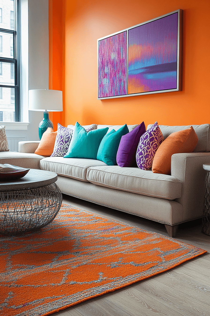 Fiery orange elements ignite colorful living room ideas with bold energy and welcoming warmth. This vibrant hue creates an inviting atmosphere. Natural tones balance the intensity. Contrasting accents enhance visual appeal. The space feels energetic yet grounded. Bring warmth into your decor with orange highlights.