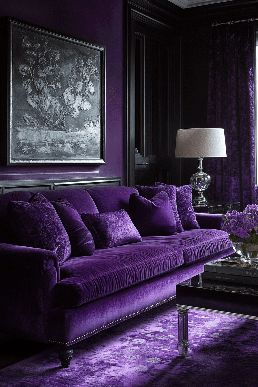 Royal purple tones enrich colorful living room ideas with elegance, depth, and cozy drama. Dark hues create a luxurious feel while lighter shades soften the palette. Metallic accents enhance the richness. The room feels refined and inviting. Color creates a striking yet balanced design. Add purple tones for bold sophistication.
