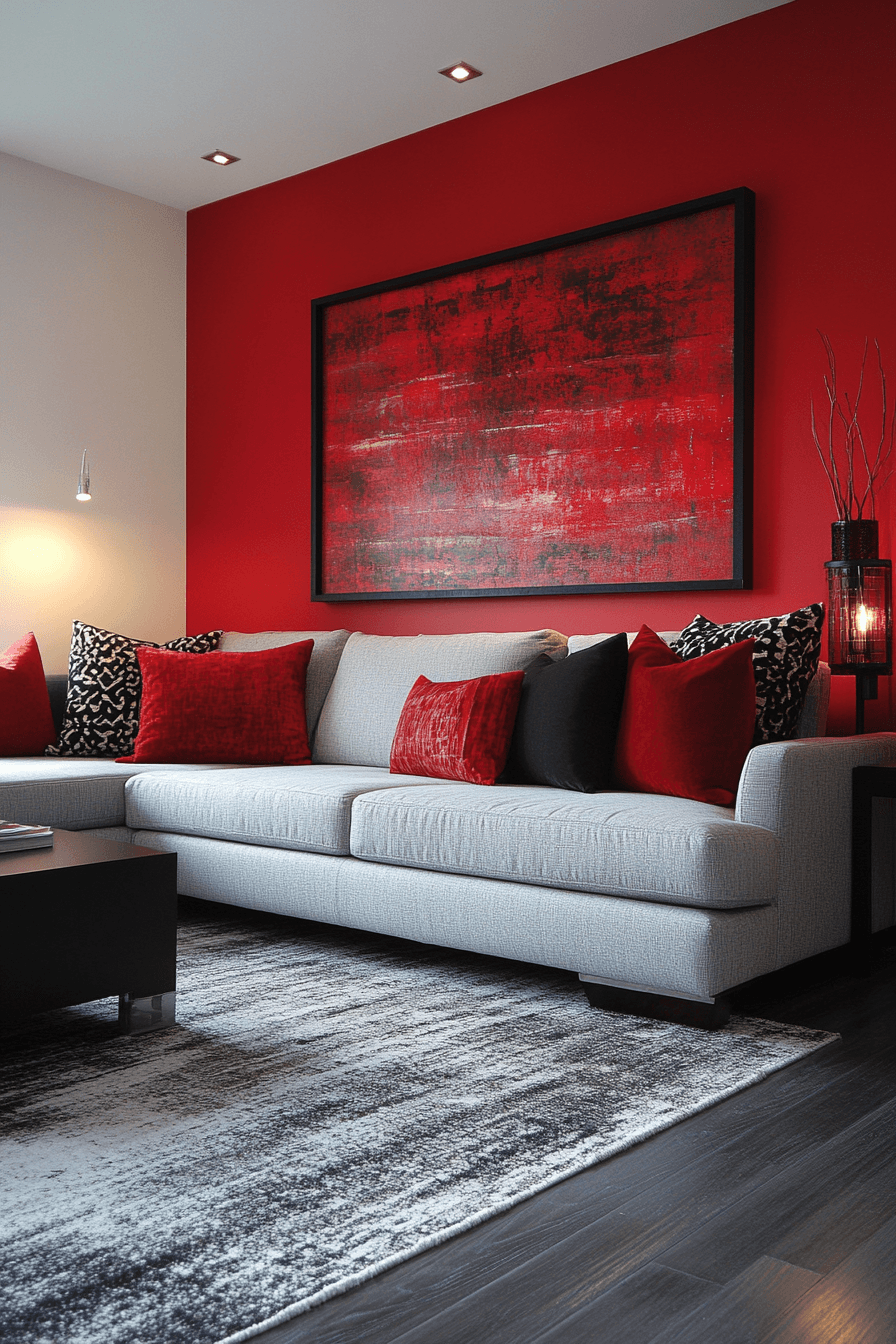Vibrant red highlights define colorful living room ideas with passion and strong visual impact. This color draws immediate attention. Neutral tones provide balance. Textures soften the intensity. The room feels bold and dynamic. Introduce red accents for a powerful design upgrade.