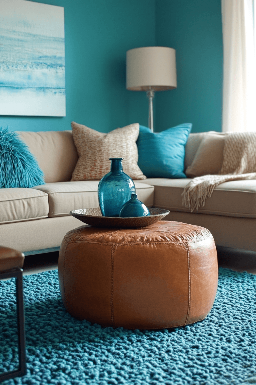 Cool turquoise hues refresh colorful living room ideas with a soothing yet vibrant aesthetic. This tone pairs effortlessly with warm neutrals. Metallic details add elegance. The room feels balanced and serene. Color adds life without clutter. Refresh your space with turquoise accents.