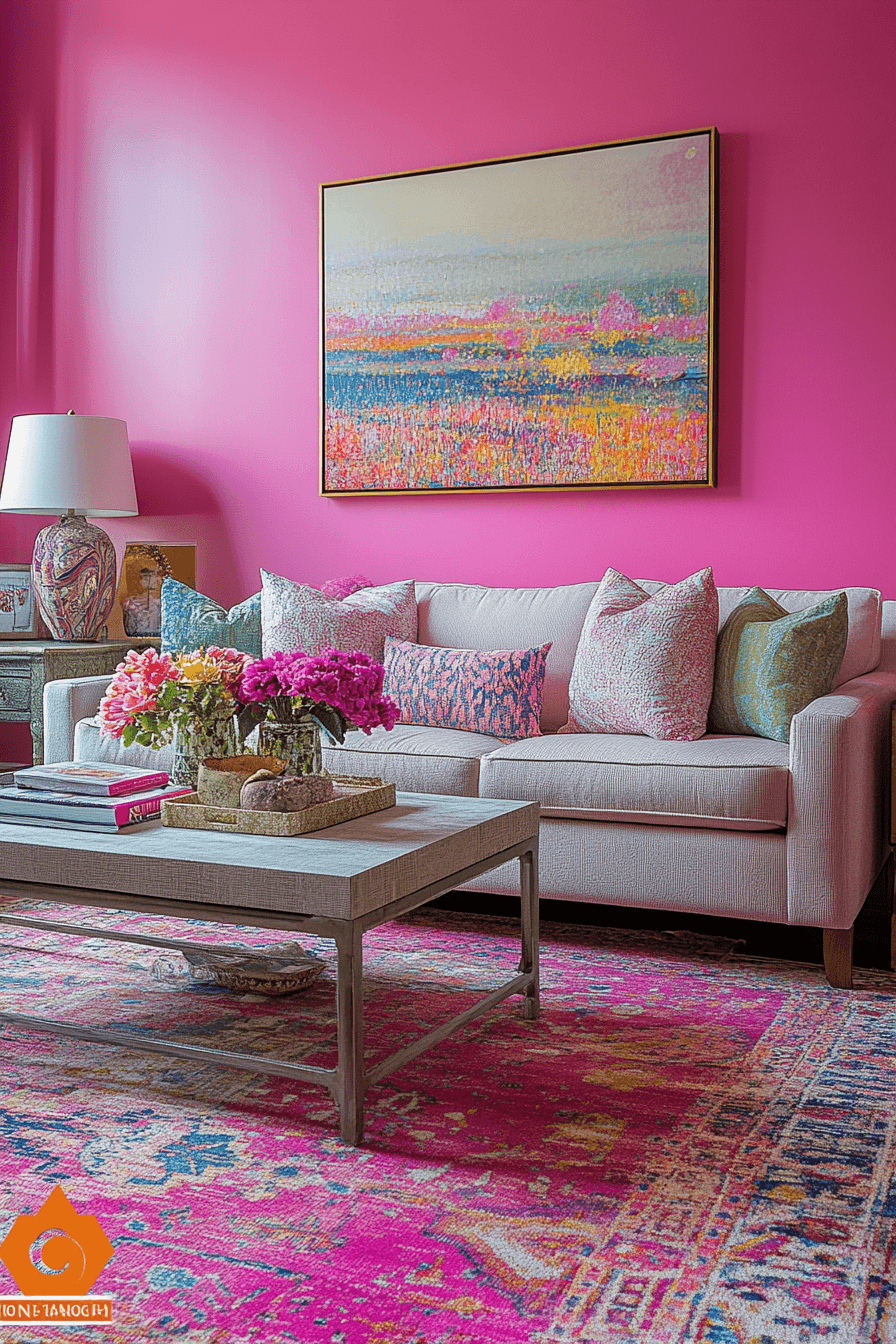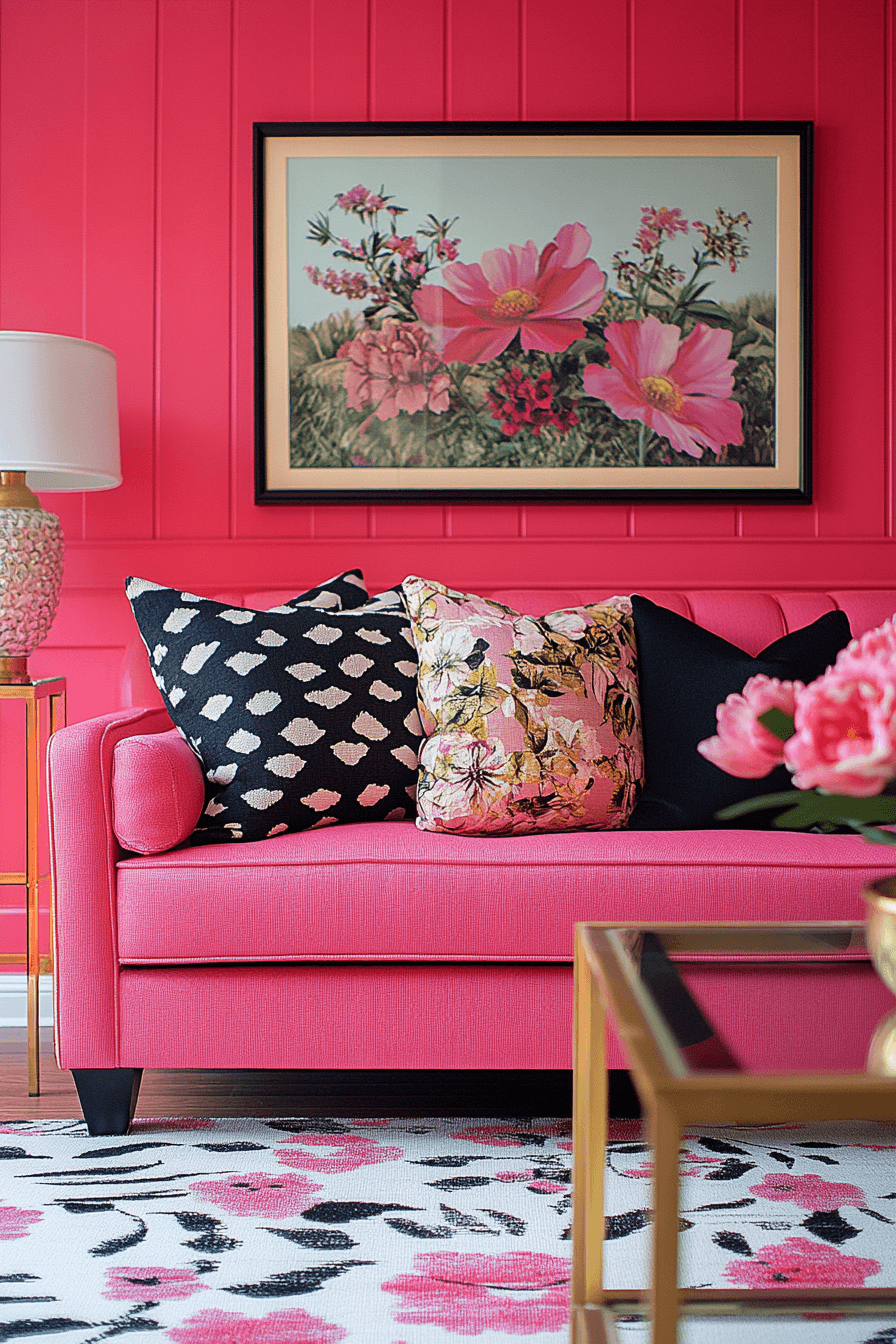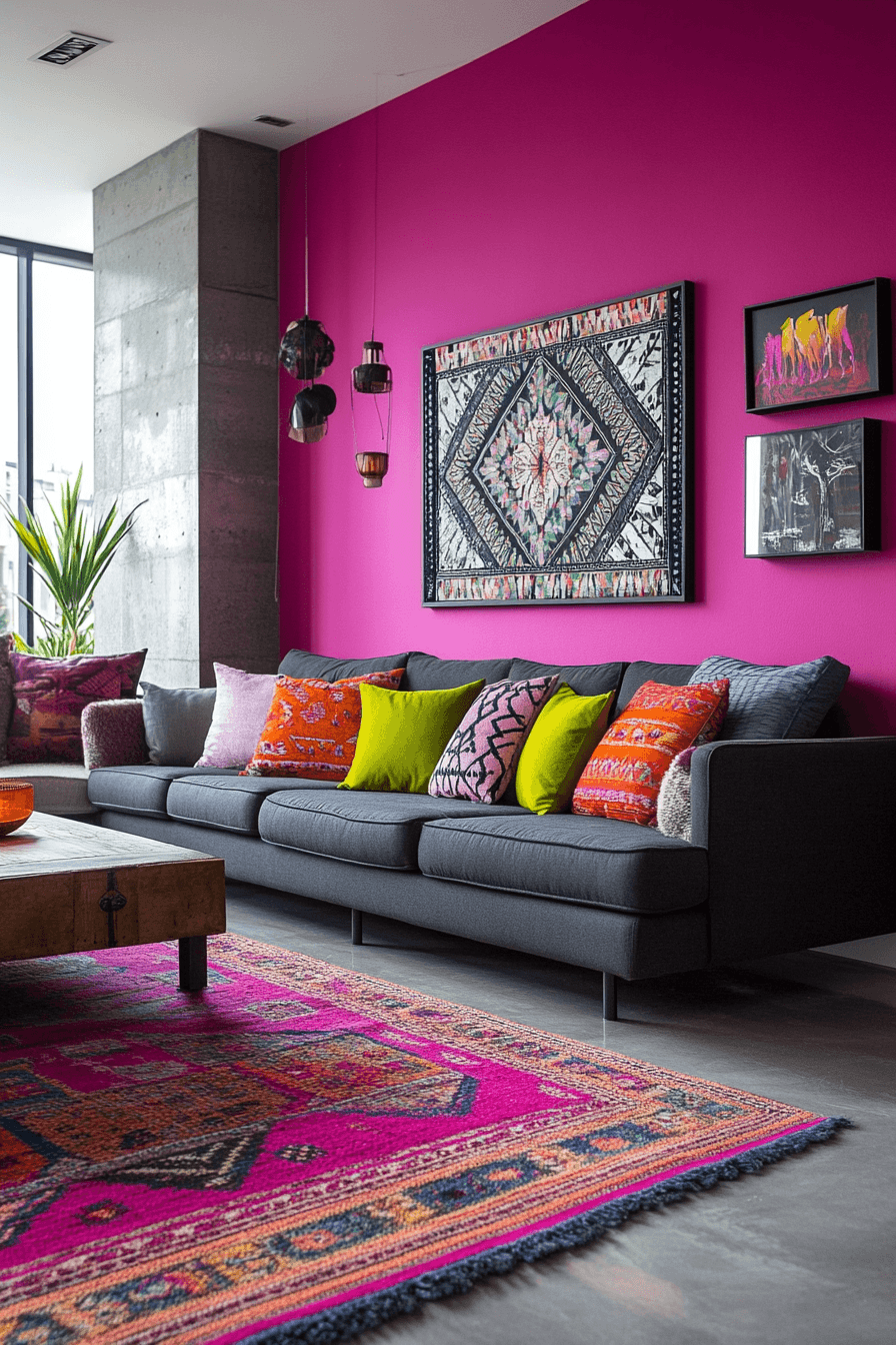 Vibrant hot pink accents transform colorful living room ideas into bold, expressive spaces filled with personality. This hue energizes the room instantly. Dark tones create contrast. The design feels playful yet polished. The space stands out beautifully. Make your living room pop with bold pink.