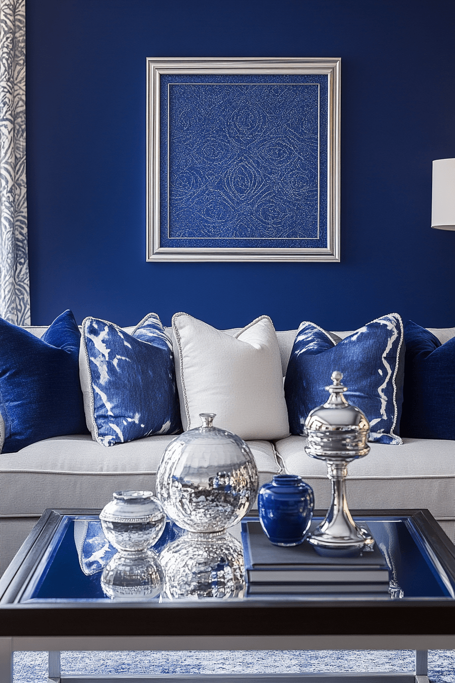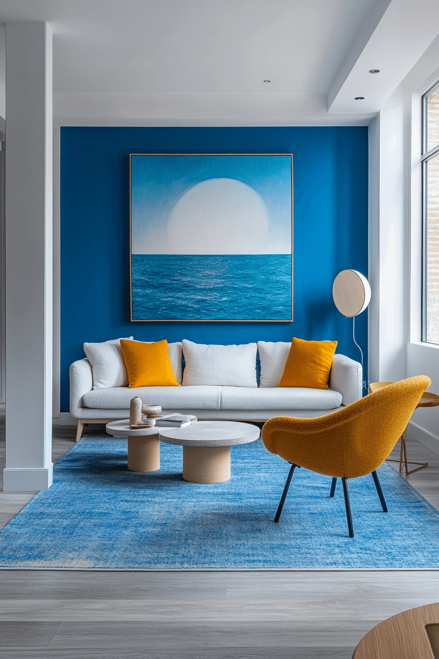 Bold cobalt shades define colorful living room ideas with striking contrast and refined elegance. This tone instantly draws attention. Neutral elements maintain balance. Reflective surfaces add a modern edge. The space feels vibrant and upscale. Make a statement with cobalt accents.
