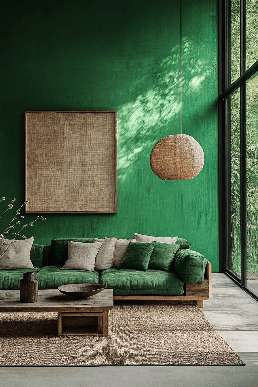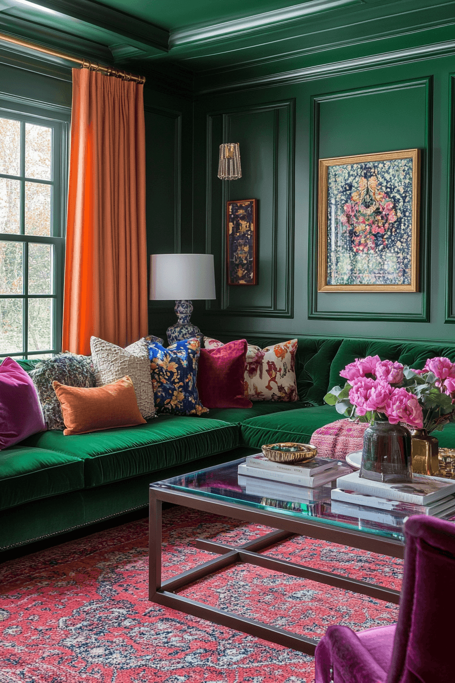 Deep green tones ground colorful living room ideas with a natural, refreshing feel that promotes calm. This shade adds richness without clutter. Wood elements enhance warmth. The room feels balanced and vibrant. Nature-inspired color creates harmony. Bring green tones into your space.