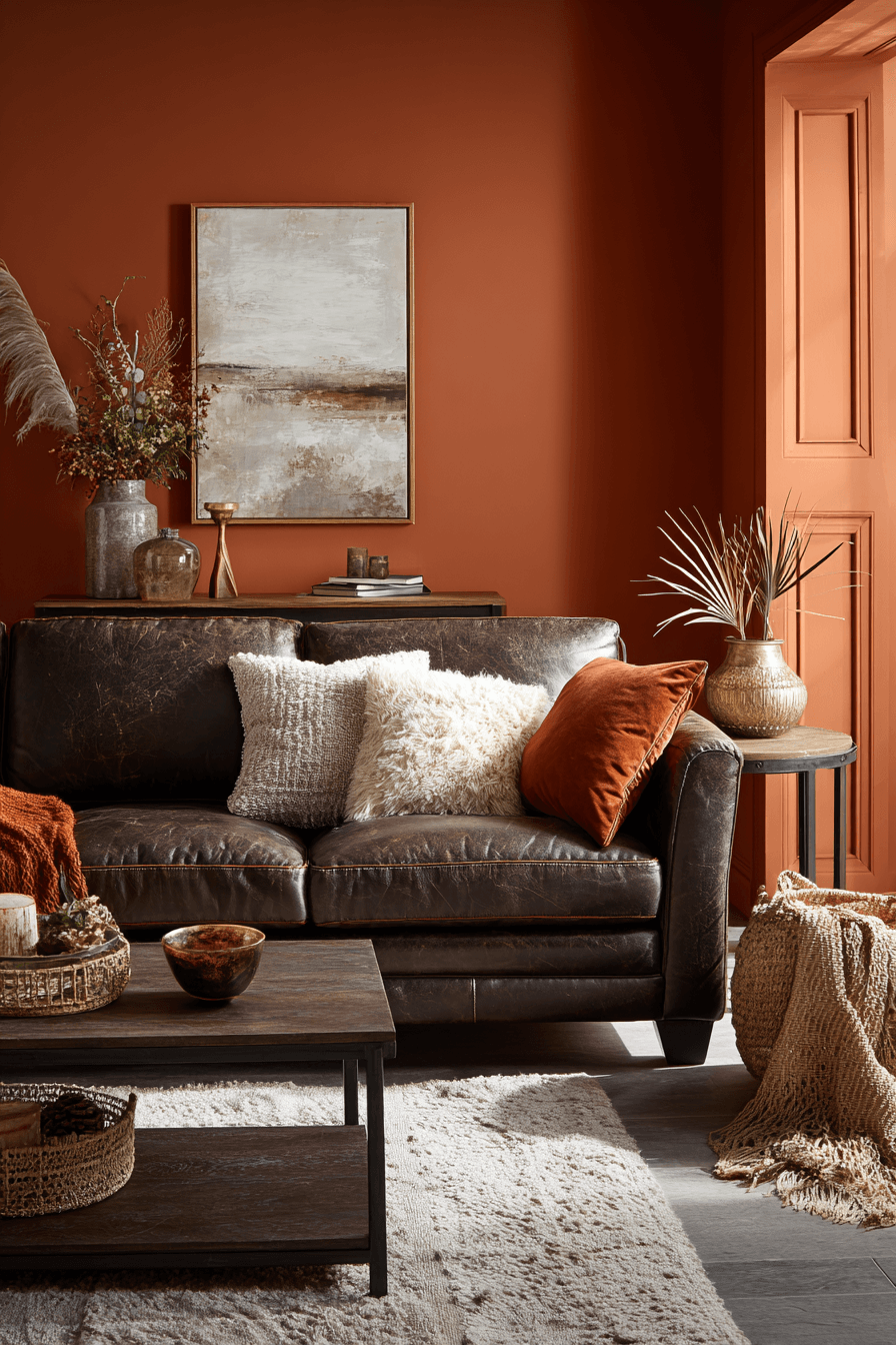 Earth-toned orange hues warm colorful living room ideas with cozy, grounded energy that feels inviting. Natural textures enhance the palette. Contrasting tones add interest. The space feels relaxed and comfortable. The design feels approachable and warm. Style your room with earthy orange shades.