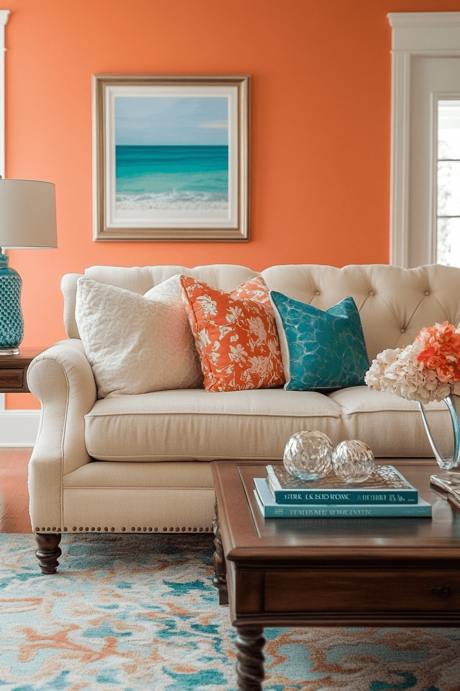 Soft coral tones brighten colorful living room ideas with cheerful warmth and welcoming energy. This hue pairs beautifully with light neutrals. Deeper accents create contrast. The space feels fresh and cozy. The palette feels lively yet balanced. Add coral for a bright, happy vibe.