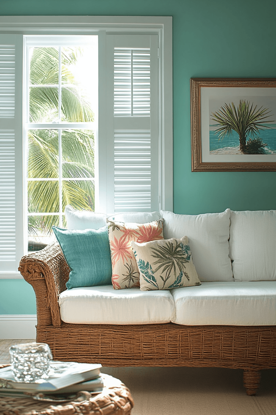 Refreshing aqua shades energize colorful living room ideas with breezy, tropical charm that feels light and fun. Crisp whites enhance the look. Patterns add playful movement. Soft furnishings keep comfort high. The space feels uplifting and relaxed. Bring tropical freshness into your decor.