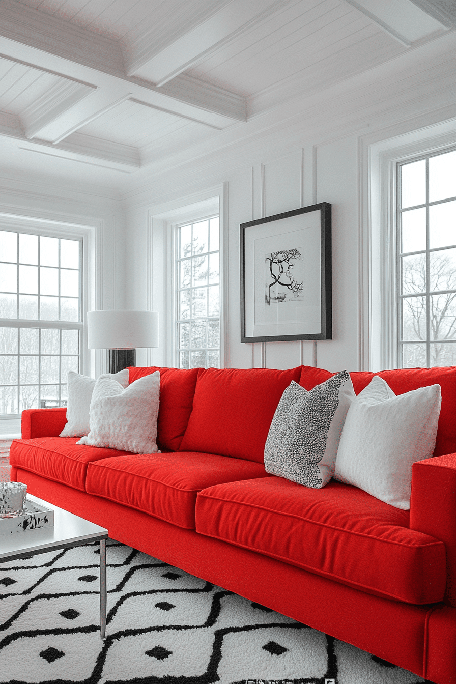 Classic red-white pairing shapes colorful living room ideas into bold yet clean designs with timeless appeal. Red energizes while white opens the space. The contrast feels crisp and fresh. Accents add visual interest. The room feels balanced and dynamic. Style your space with timeless contrast.