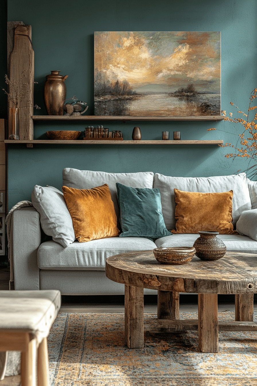 Elegant teal tones enhance colorful living room ideas with calming richness and cozy depth. This shade blends effortlessly with neutrals. Metallic accents elevate the design. The space feels refined and inviting. The palette feels balanced and soothing. Create a teal-inspired retreat.