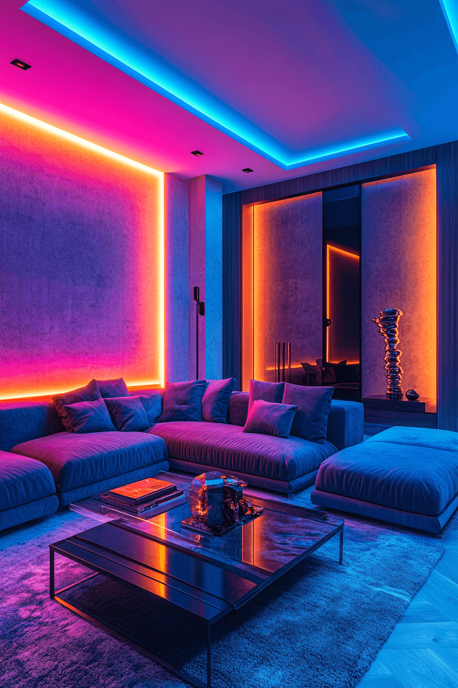Glowing neon accents elevate colorful living room ideas with striking pops of light that energize the entire space. Bright details contrast beautifully with minimal surroundings. LED elements enhance the modern vibe. The atmosphere feels vibrant and fun. Perfect for creative environments. Add glowing accents to make your space stand out.