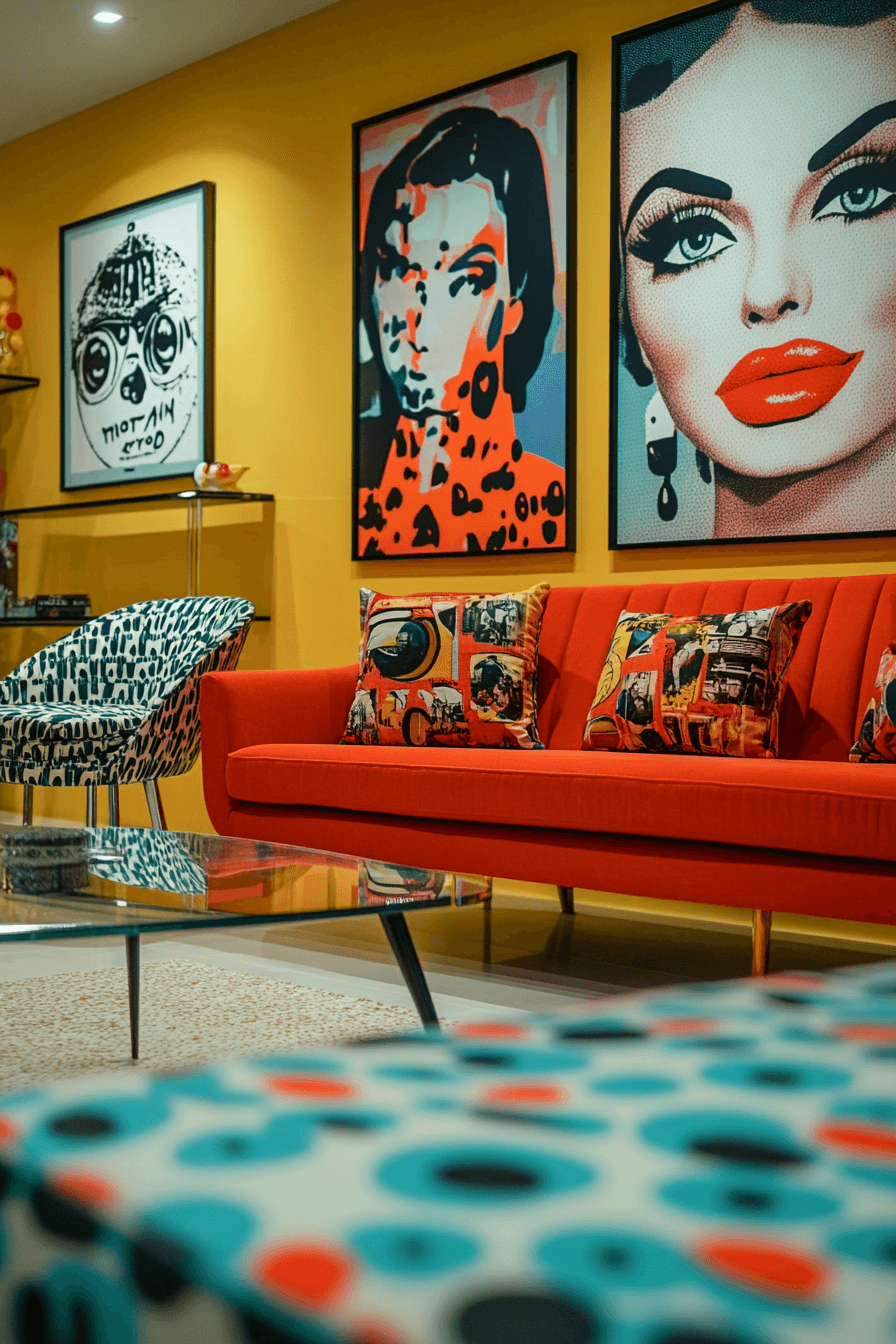 Bold artwork drives colorful living room ideas with expressive visuals that create instant personality. Graphic prints become standout features. Bright decor elements tie everything together seamlessly. The space feels artistic and playful. Creativity shines throughout the room. Turn your living area into a visual masterpiece.