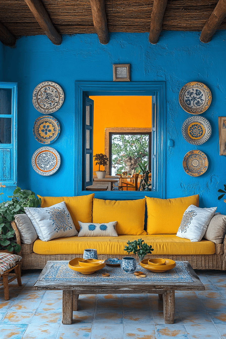 Sunlit palettes brighten colorful living room ideas with cheerful tones that feel warm and uplifting. Blues and yellows mimic natural elements beautifully. Earthy accents add grounding contrast. The space feels fresh and welcoming. The vibe is relaxed and vibrant. Create a sun-inspired living room atmosphere.