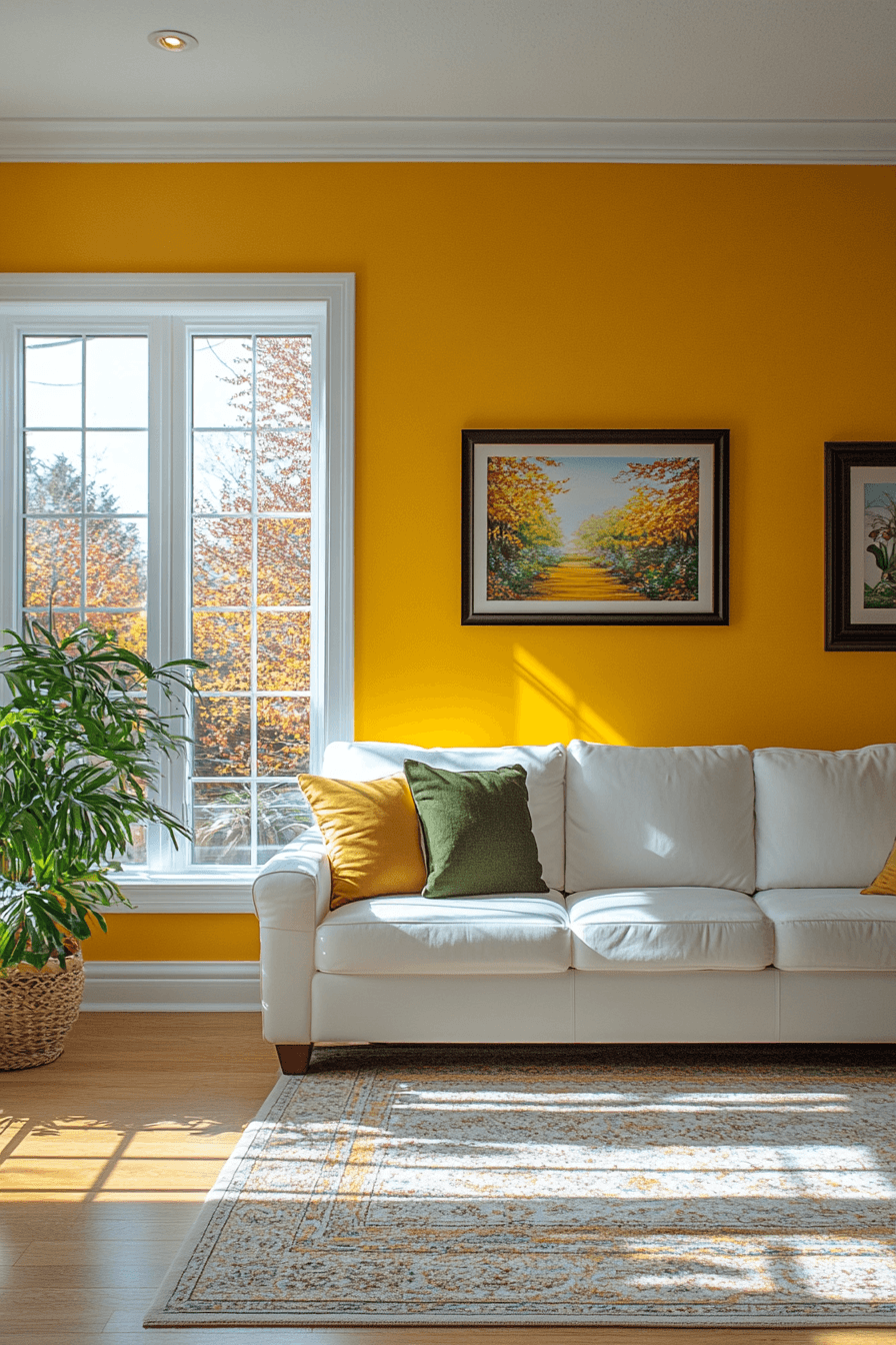 Golden yellow accents energize colorful living room ideas with warmth and positivity that instantly lifts the mood. Bright tones visually expand the space. Balanced combinations keep everything modern. Soft textures add comfort. The room feels lively and inviting. Add sunshine tones to transform your living area.