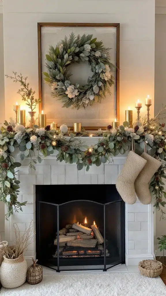 The Rustic Luxe Christmas Mantel design combines the warmth of natural wood garlands, pinecones, and frosted eucalyptus with the glamour of gold and silver votives. The earthy green and brown tones complement the shimmering metallics, creating a balanced and festive color palette. Thoughtful layering of decor, like staggered ornaments and varying heights of candles, adds depth and sophistication. This mantelscape blends rustic charm with luxurious elegance, making it an inviting focal point for holiday celebrations.