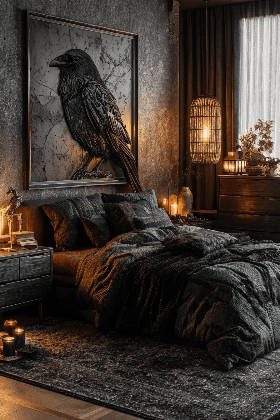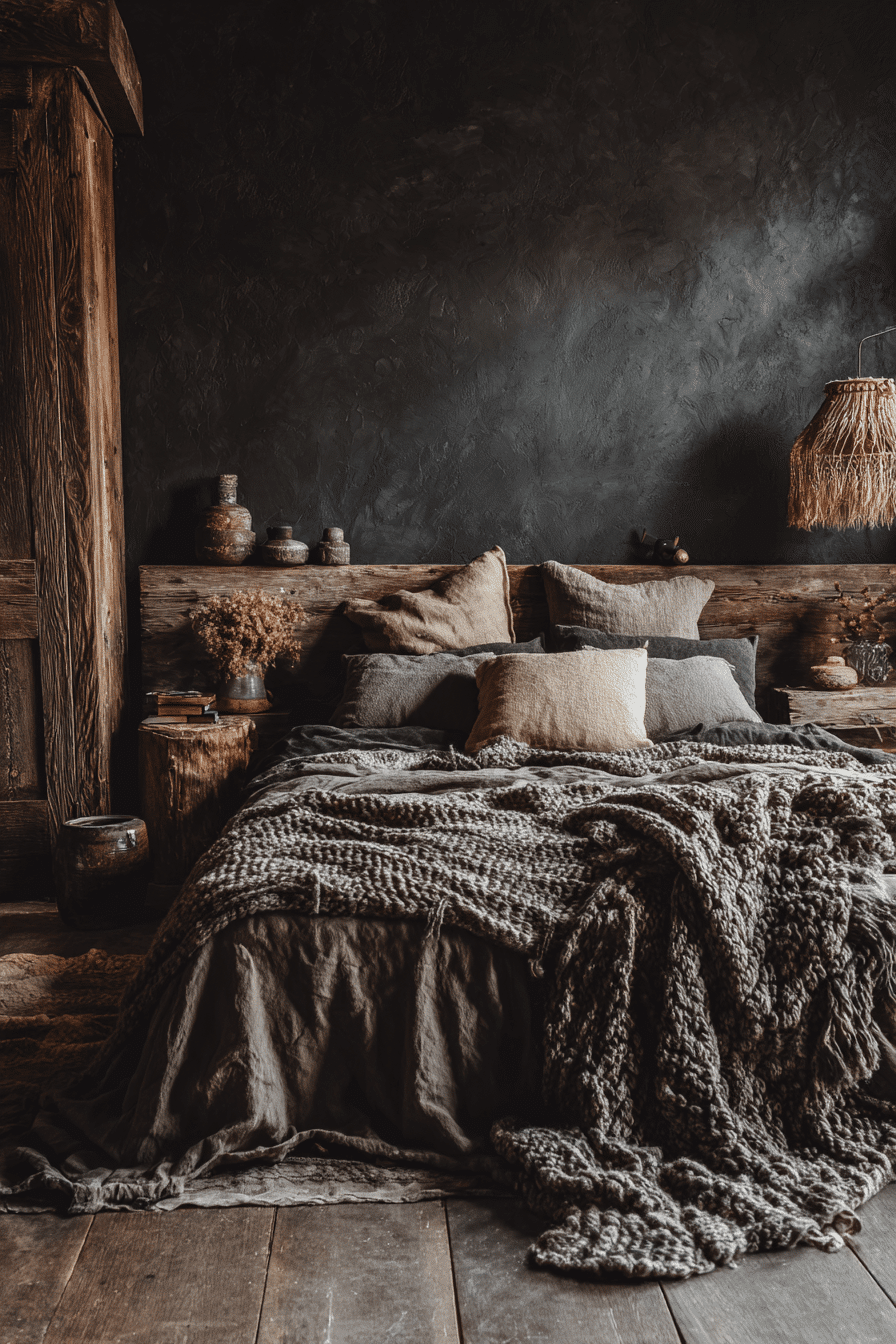 A rich mix of shadowy tones and soft fabrics creates a dark boho bedroom that feels bold yet deeply comforting. Black accents paired with layered textiles build a cozy, grounded atmosphere. Natural materials like wood and woven fibers soften the intensity of the palette. The balance between depth and warmth keeps the space inviting. Every detail feels intentional and relaxed. Transform your bedroom with this moody boho style.
