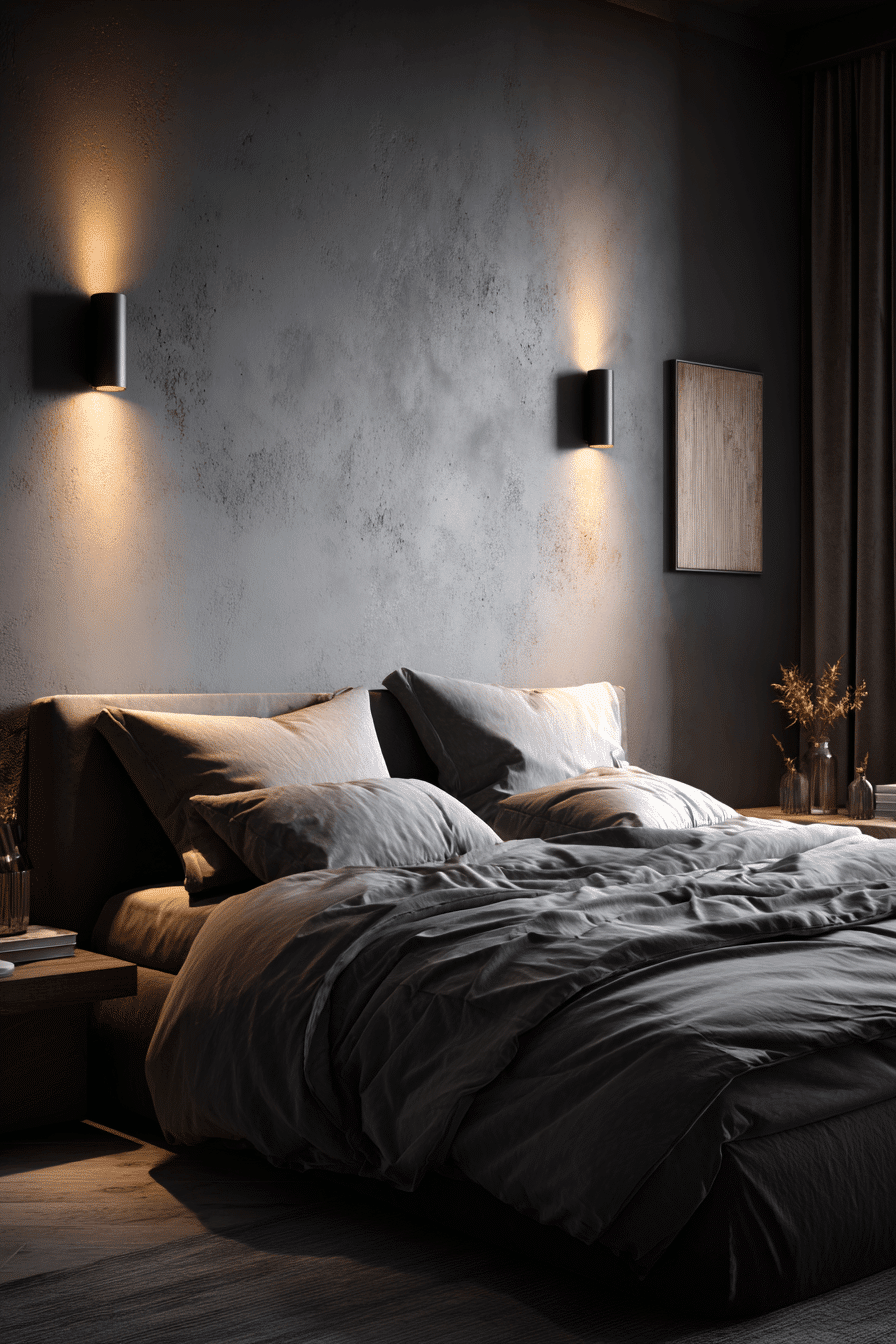 Soft lighting and warm tones create a glowing atmosphere in this dark boho bedroom. Gentle grays and taupes build a calming palette. Minimal furnishings keep the space uncluttered. Textured accents add subtle depth. The room feels cozy and inviting. Refresh your space with warm lighting.
