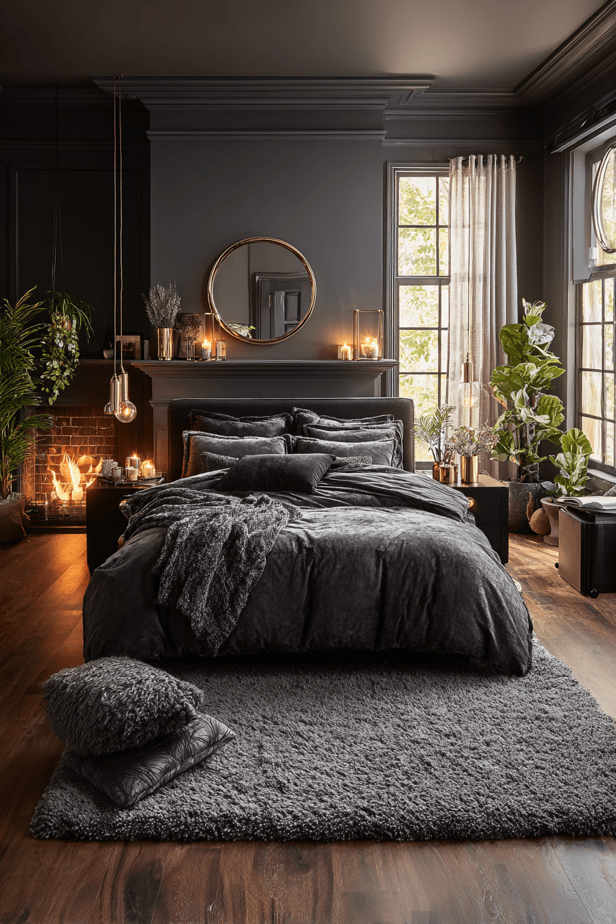 A smooth blend of black and gray tones creates a dark boho bedroom that feels calm and grounded. Soft fabrics and flowing shapes add movement to the design. Each element works together in harmony. The layout feels simple yet visually interesting. The space feels peaceful and cozy. Design a balanced, moody retreat.