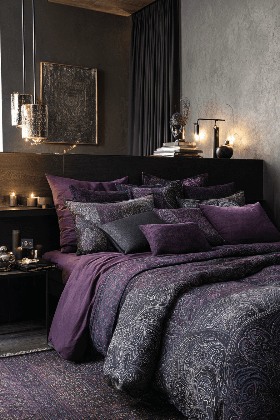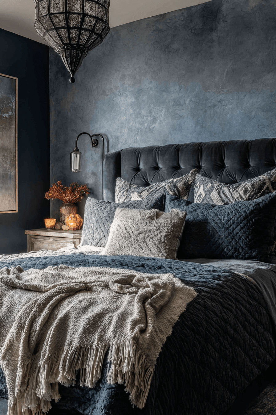 Velvet textures and subtle metallics create a dark boho bedroom that feels soft and luxurious. Smoky hues paired with gentle shine add depth. Plush bedding becomes the focal point. Warm lighting enhances every texture. The space feels refined and cozy. Add a touch of luxury to your design.