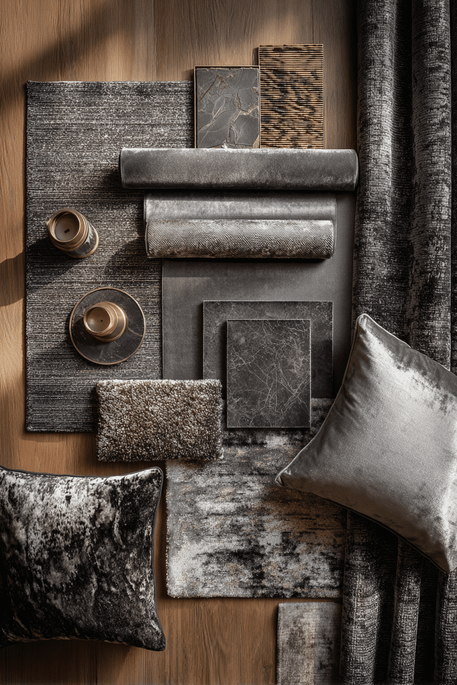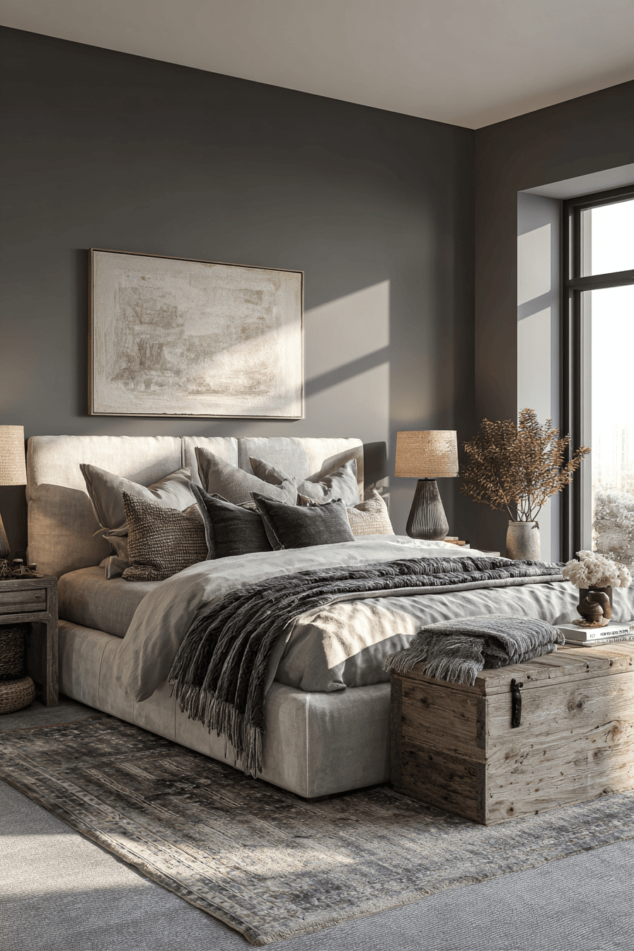 A grayscale palette defines this dark boho bedroom with a modern and grounded feel. Layered textures add depth and warmth. Clean lines keep the design balanced. Each detail feels intentional and cohesive. The space feels calm and expressive. Embrace a neutral, moody style.