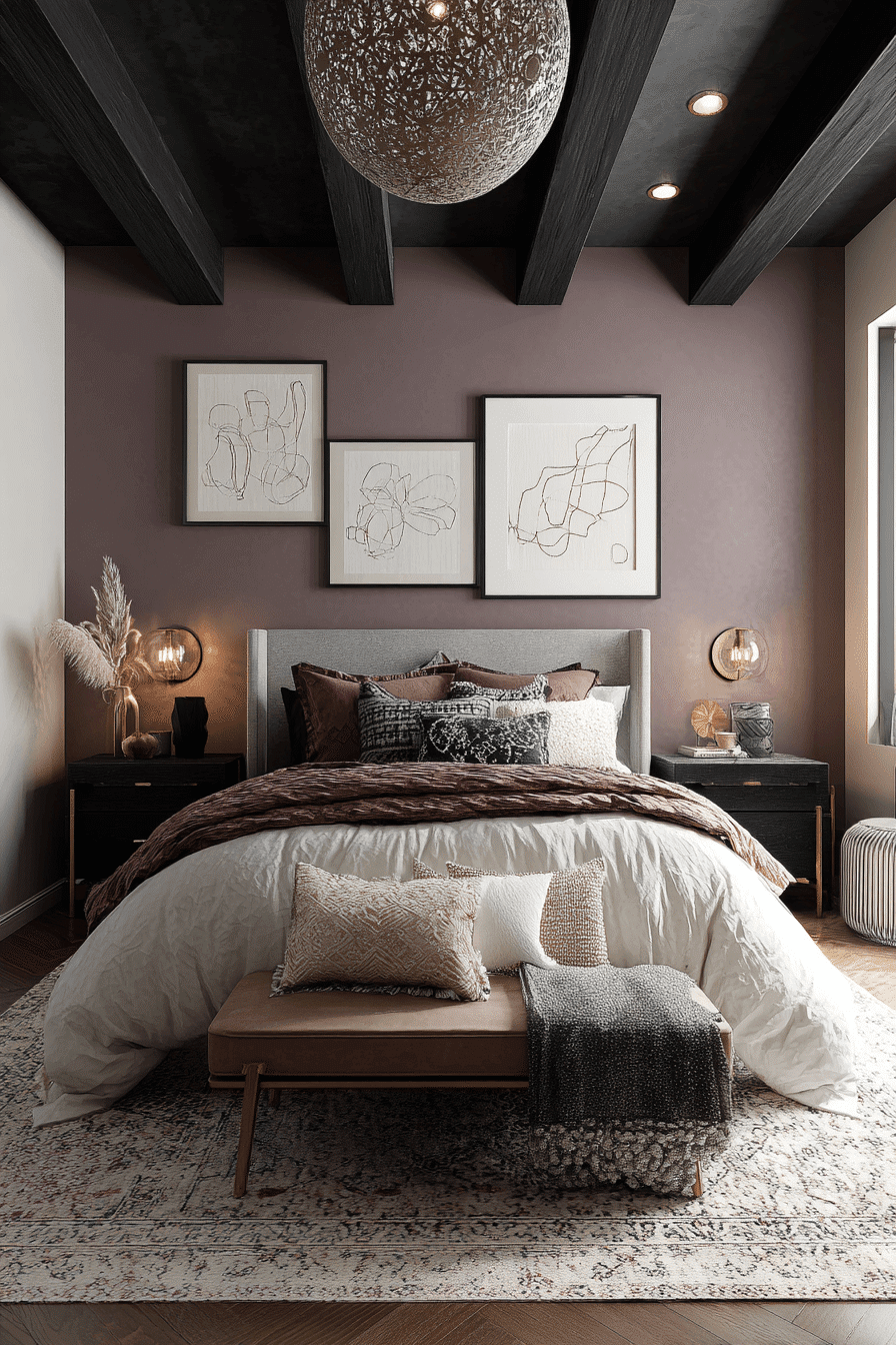 Soft contrasts between darker shades and lighter elements create a dark boho bedroom that feels balanced and serene. Light wood and neutral accents soften charcoal tones. Clean lines keep the space open while textures add warmth. Subtle metallic finishes introduce a gentle glow. The design feels modern and welcoming. Build a calm, cozy retreat.
