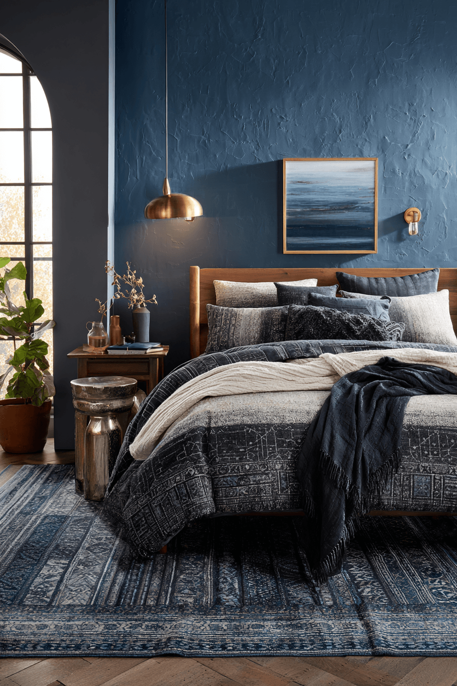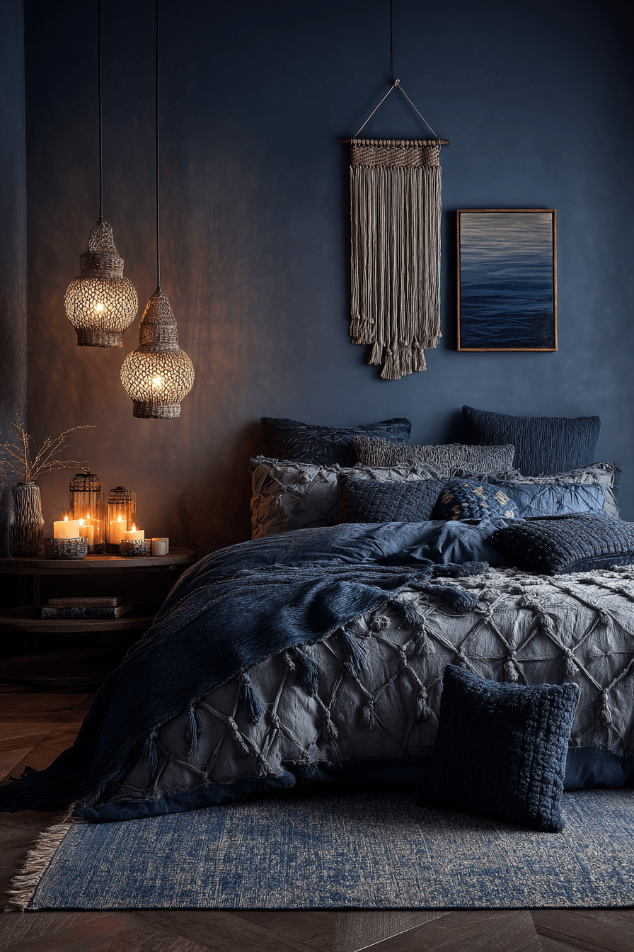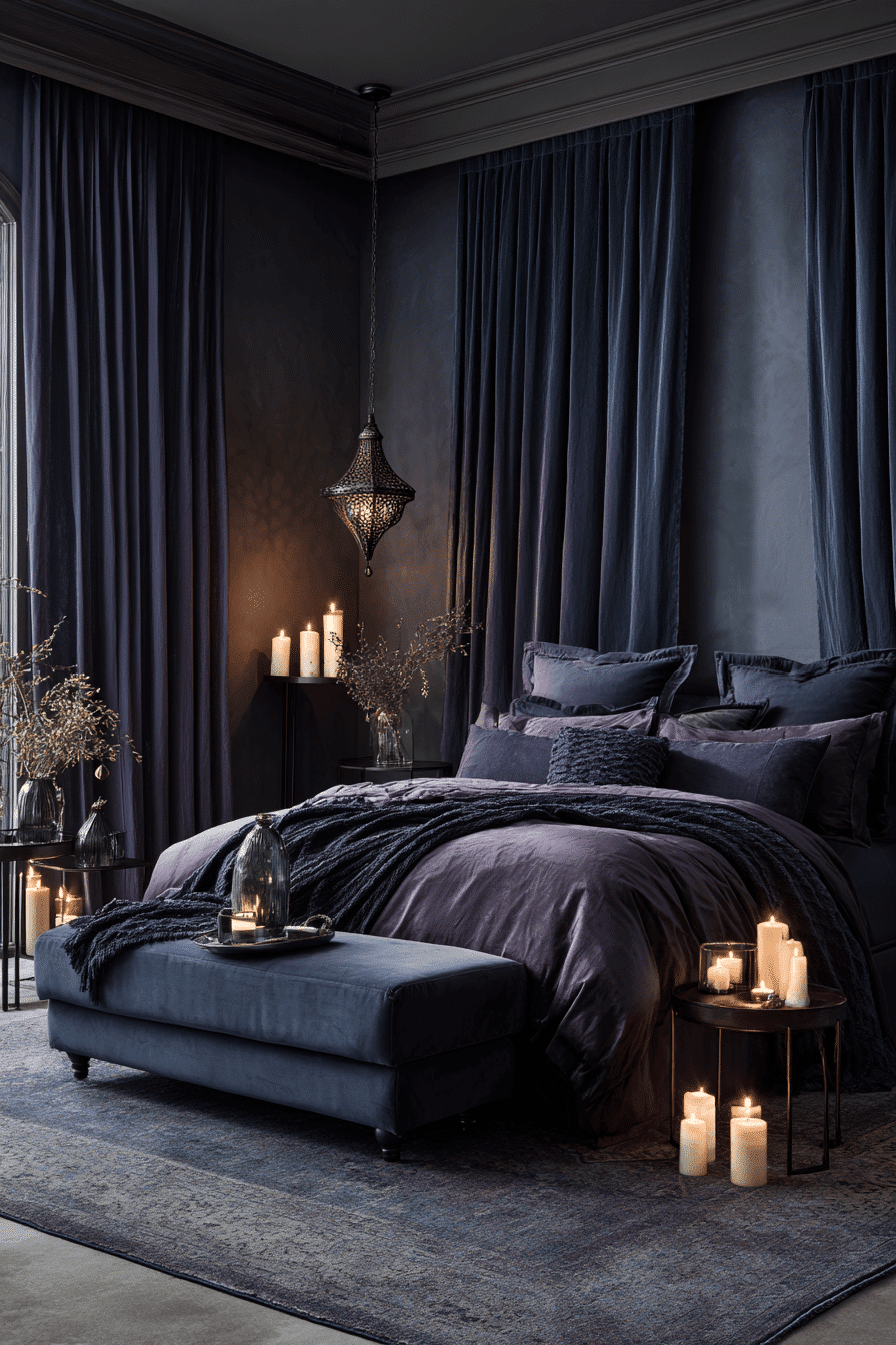 Deep black and navy tones create a serene atmosphere in this dark boho bedroom. Minimal decor allows the colors to stand out. Soft textiles add warmth and balance. The design feels simple yet impactful. The space invites rest and relaxation. Create a peaceful, moody retreat.