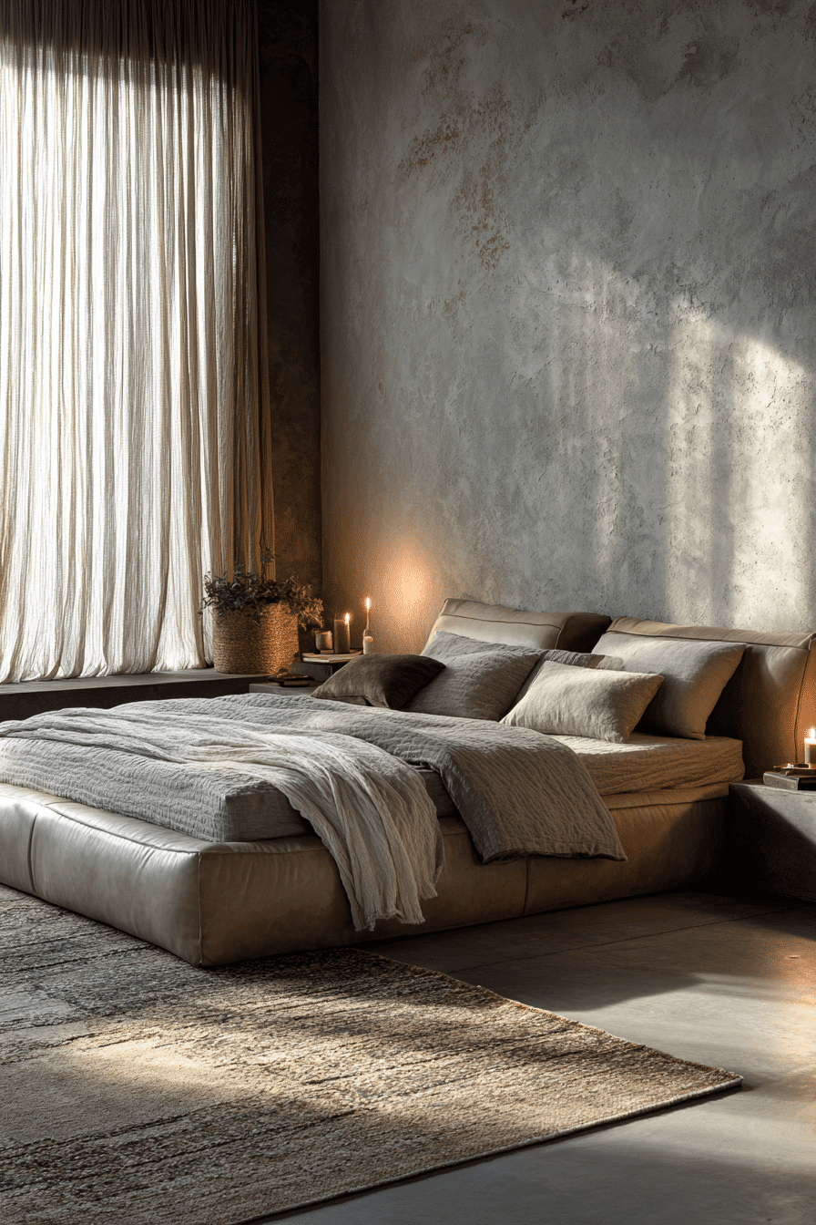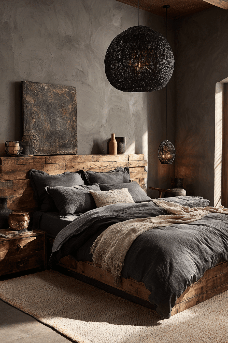 Volcanic-inspired textures bring bold energy into this dark boho bedroom. Matte finishes and layered fabrics create depth. Neutral accents balance the dramatic palette. Minimal decor keeps the space clean. The result feels grounded and cozy. Get inspired by nature-driven design.