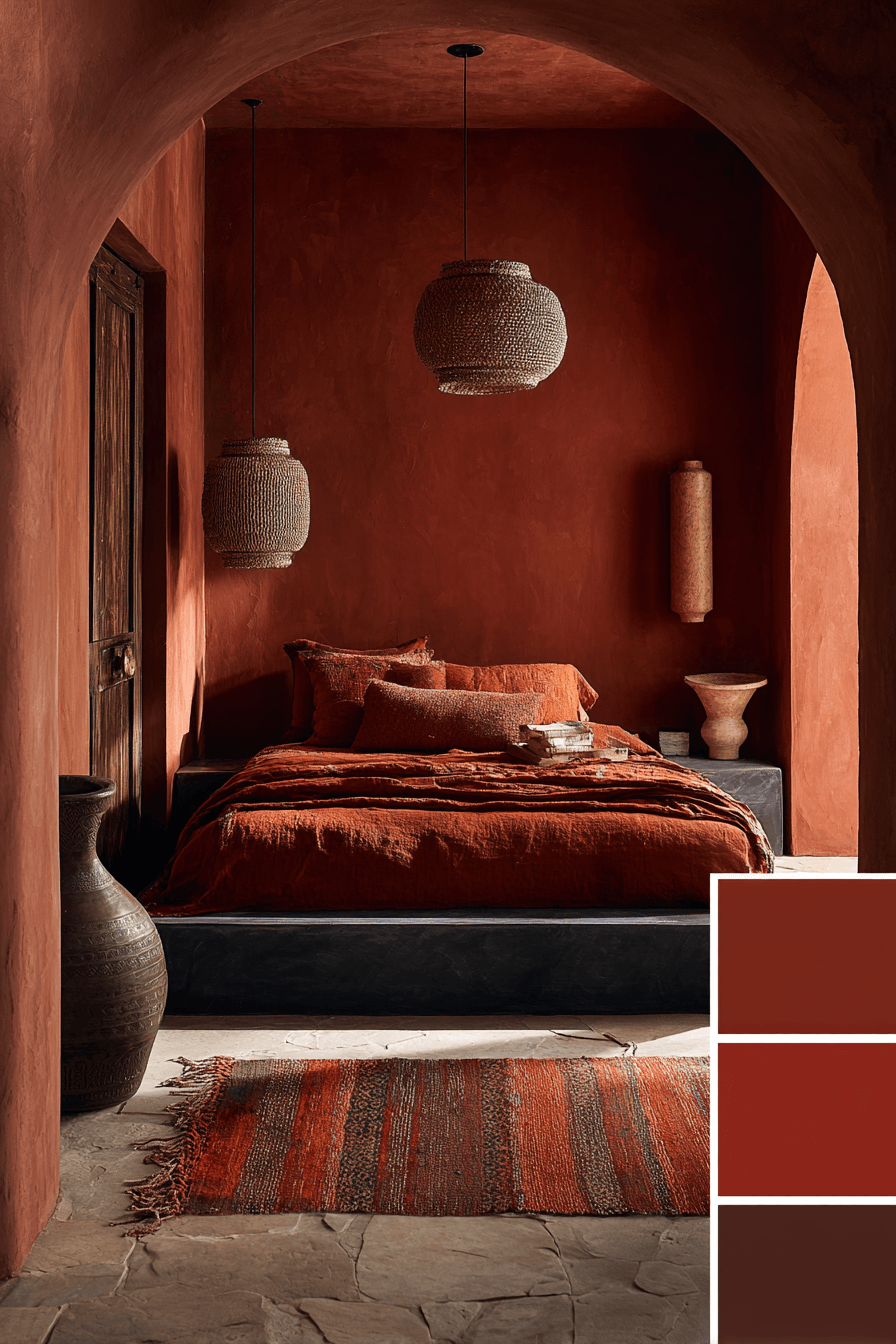 Deep red and brown hues shape a dark boho bedroom that feels bold and inviting. Matte finishes keep the design refined. Clean lines balance the richness of the colors. The space feels intense yet comfortable. It’s a perfect mix of warmth and drama. Style your room with bold tones.