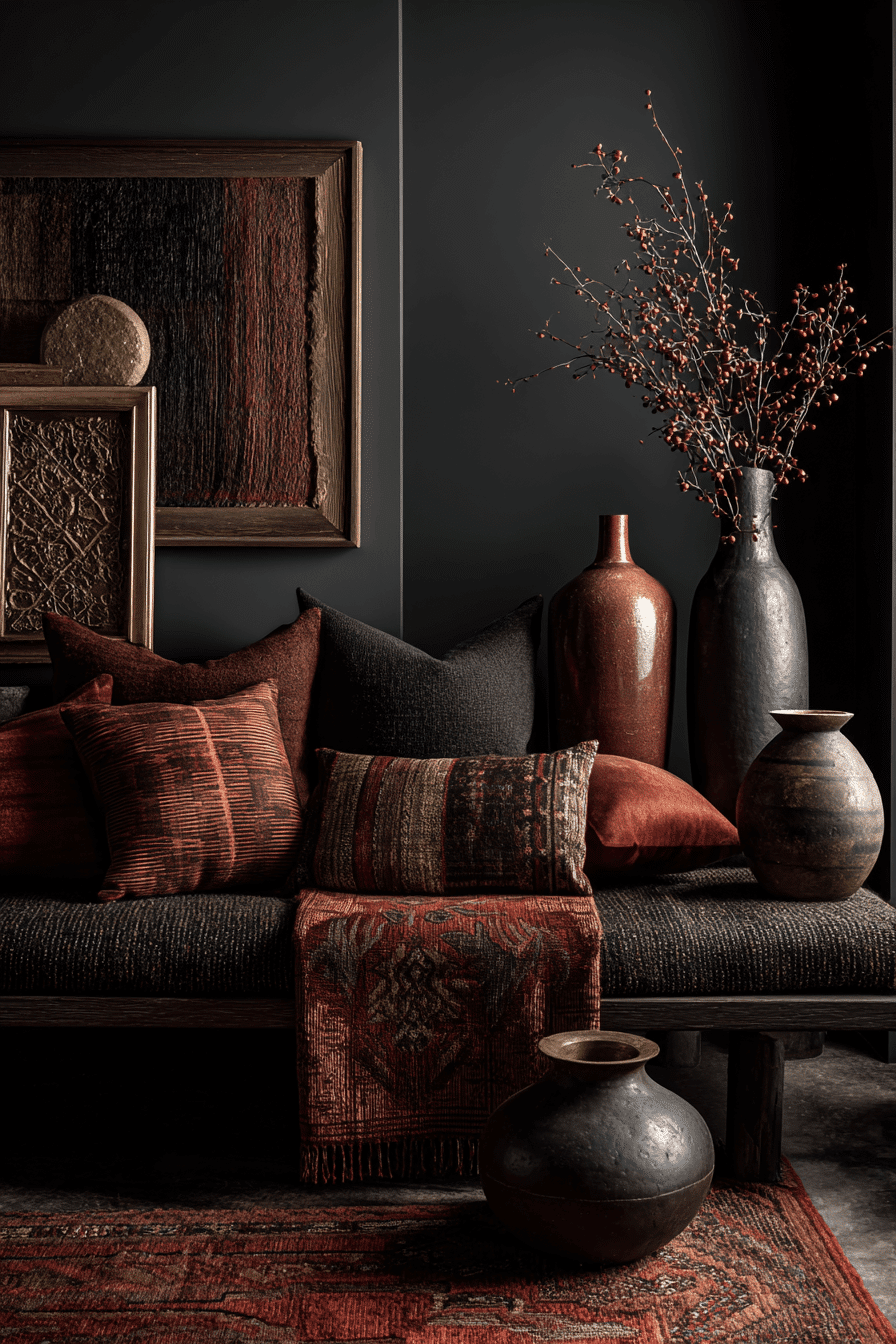 A mix of warm and cool tones creates contrast in this dark boho bedroom. Fiery accents stand out against neutral backgrounds. Sculptural decor adds depth and interest. The design feels bold yet balanced. The space remains inviting and cozy. Explore dynamic color combinations.