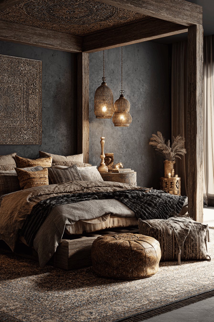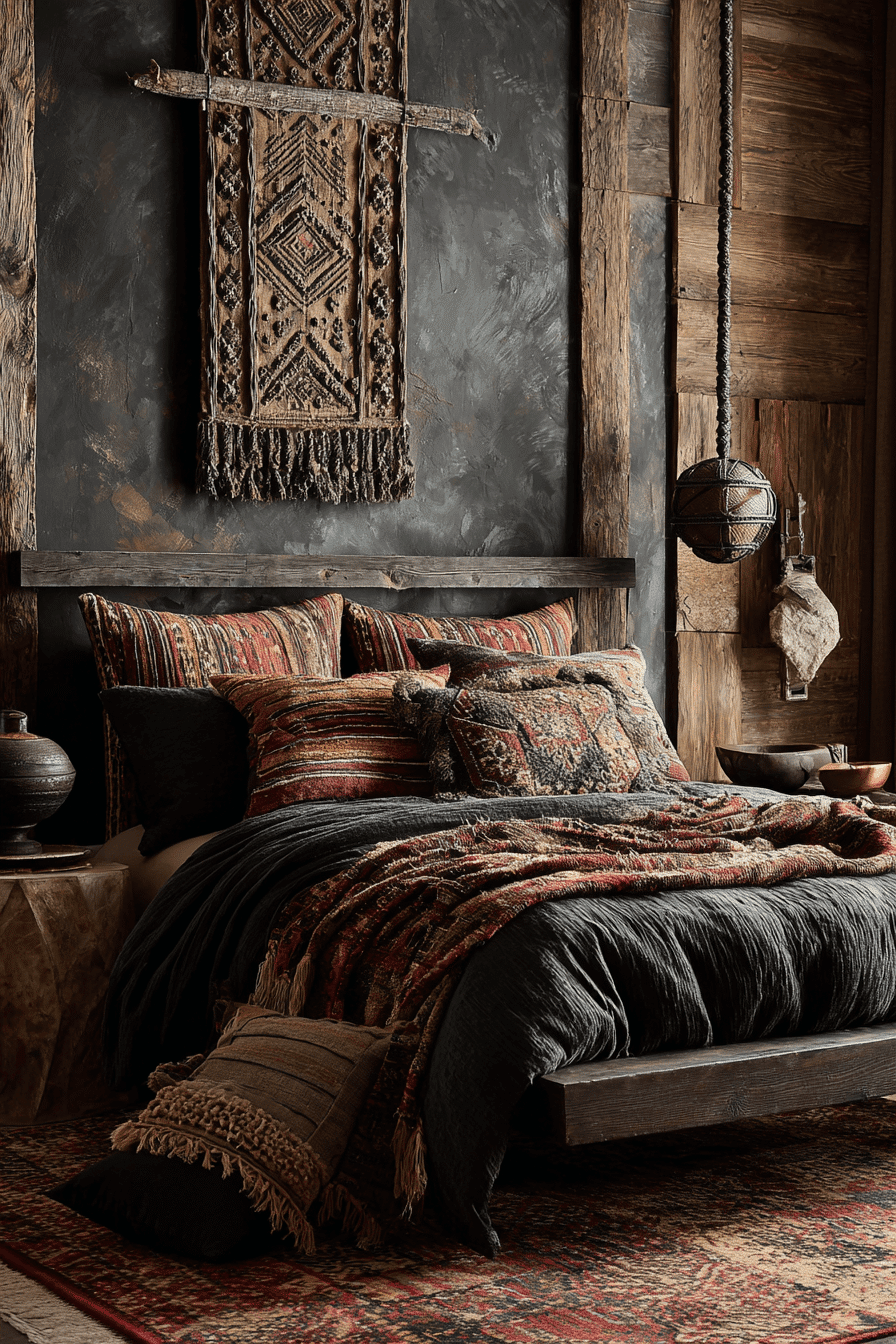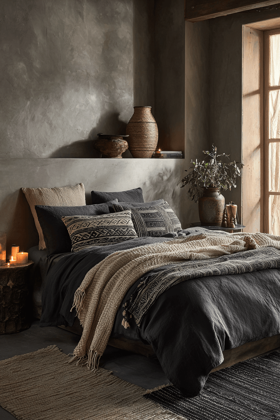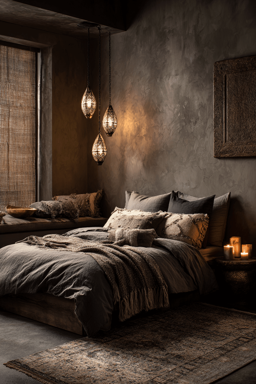 Layered shadows and textures give this dark boho bedroom a rich and immersive feel. Charcoal tones and soft lighting create depth. Repeating patterns add movement throughout the space. The atmosphere feels artistic and calming. Every detail adds to the overall mood. Build depth with layered design.