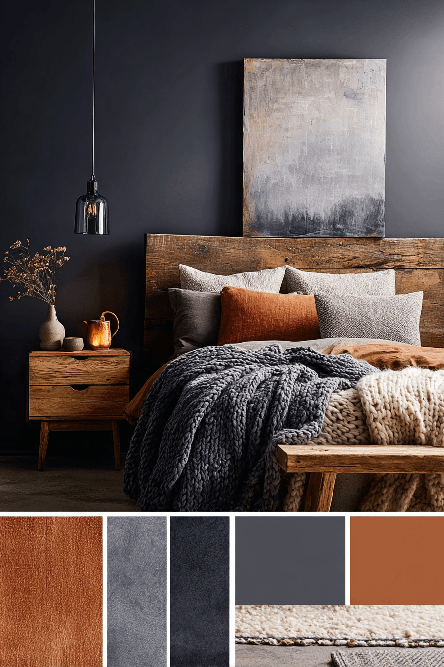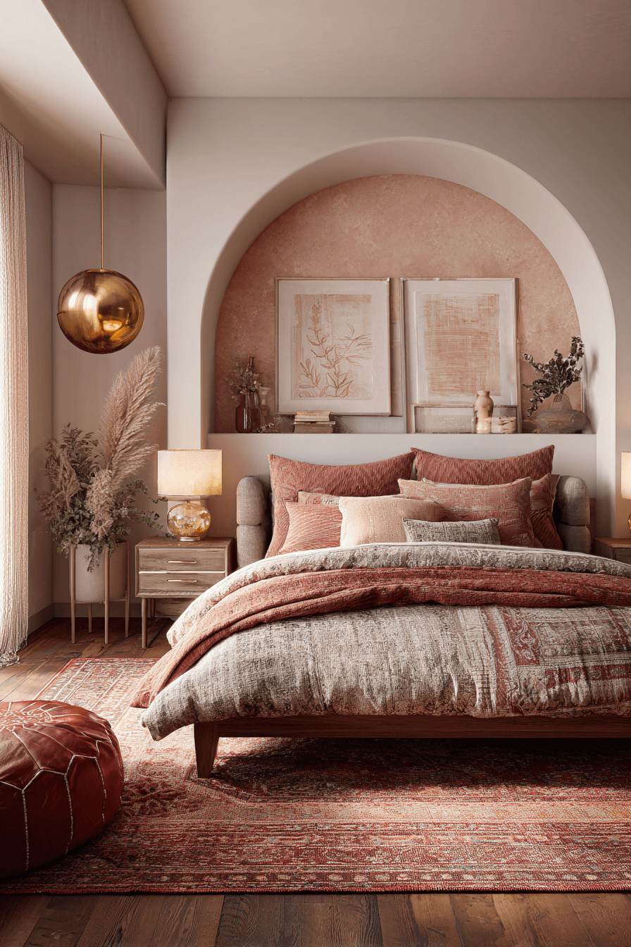 Warm ember tones create a glowing effect in this dark boho bedroom. Deep hues blend seamlessly with softer shades. Clean lines keep the design modern. The atmosphere feels cozy and refined. Every detail adds warmth. Bring this glowing palette into your home.