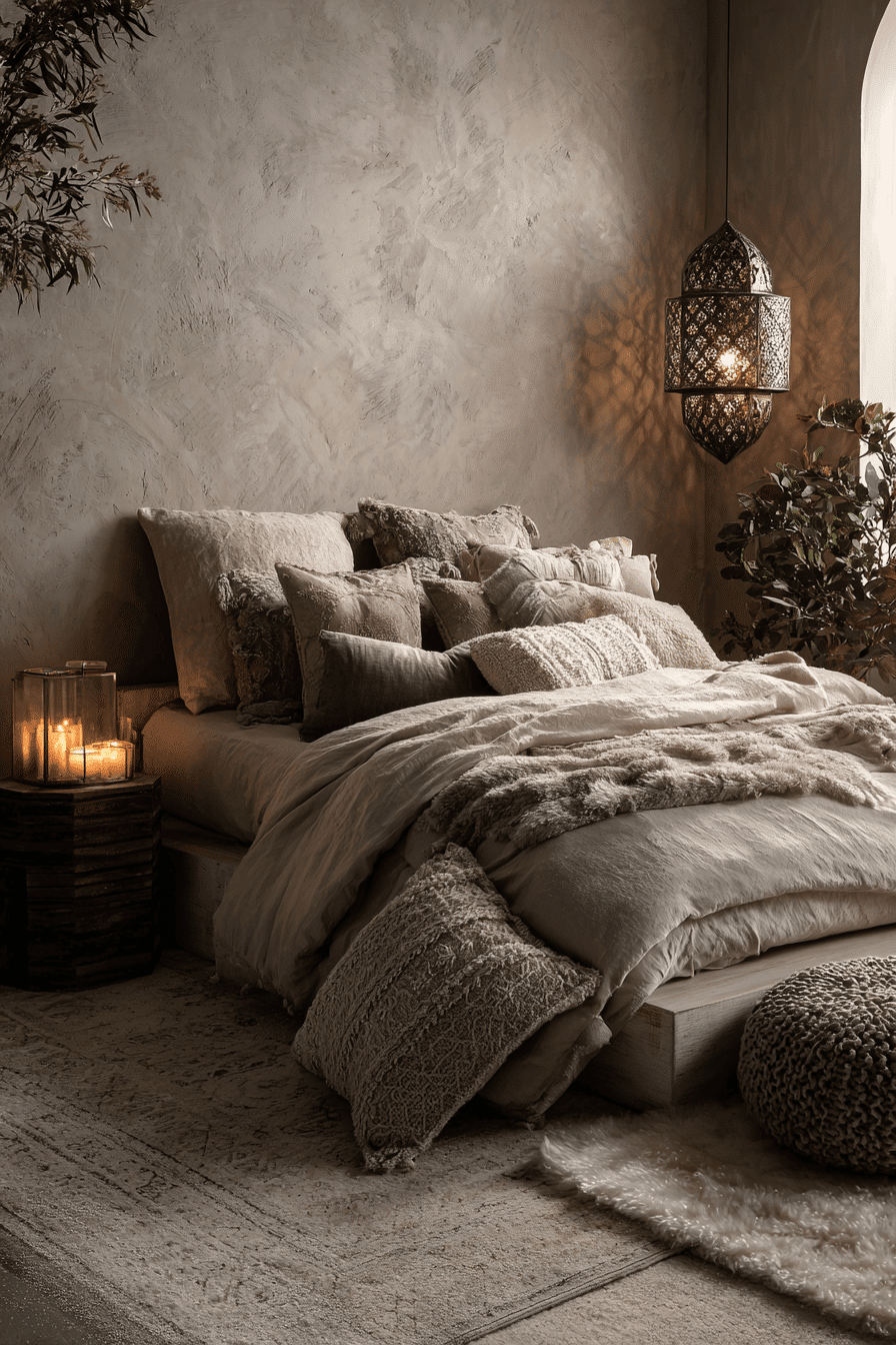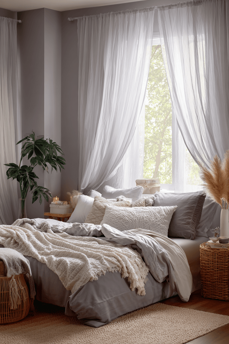Misty tones bring softness into a dark boho bedroom while maintaining depth. Shades of gray and mauve create a calming palette. Flowing fabrics enhance the airy feel. The space feels serene and inviting. It’s perfect for relaxation. Create a soft, moody retreat.