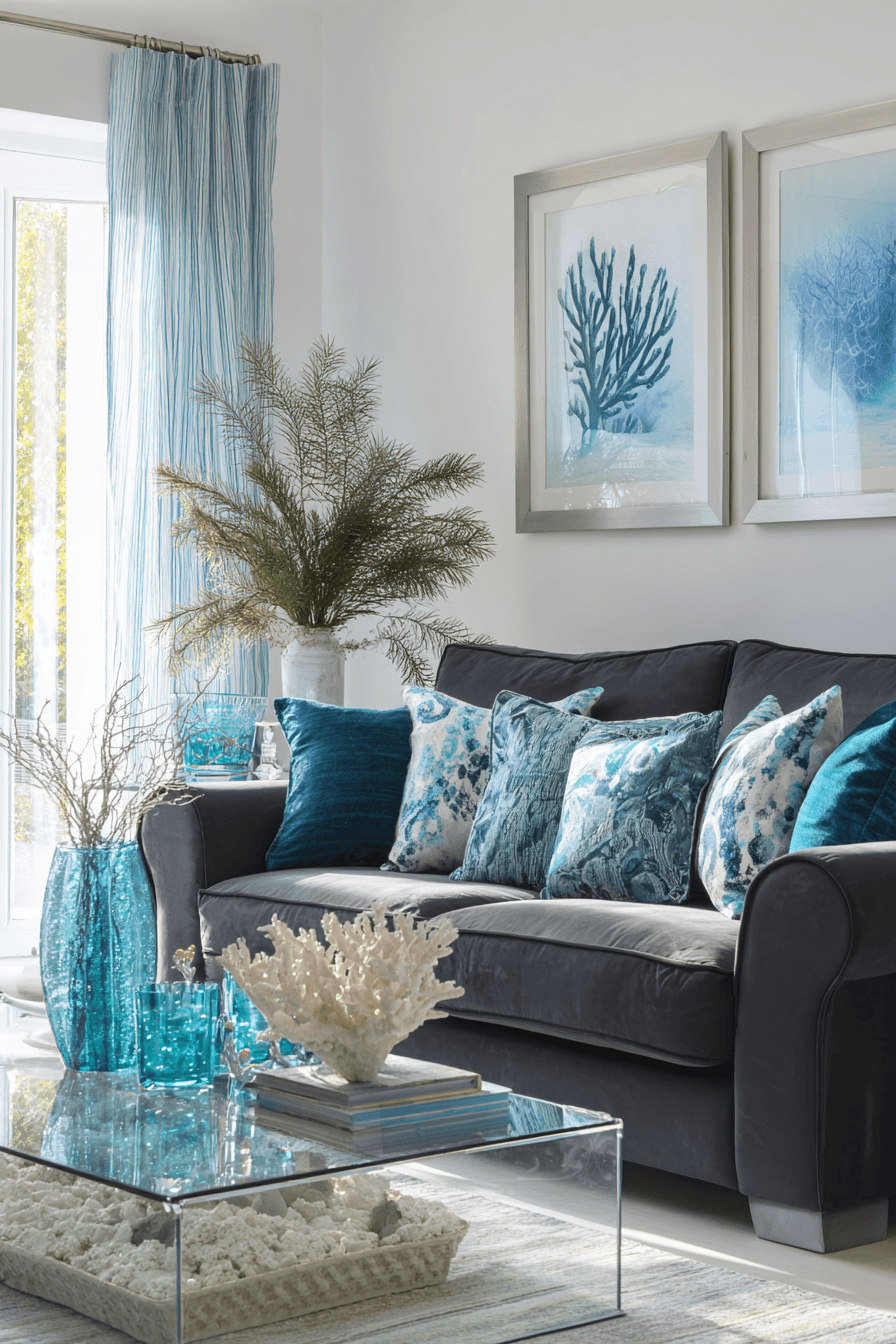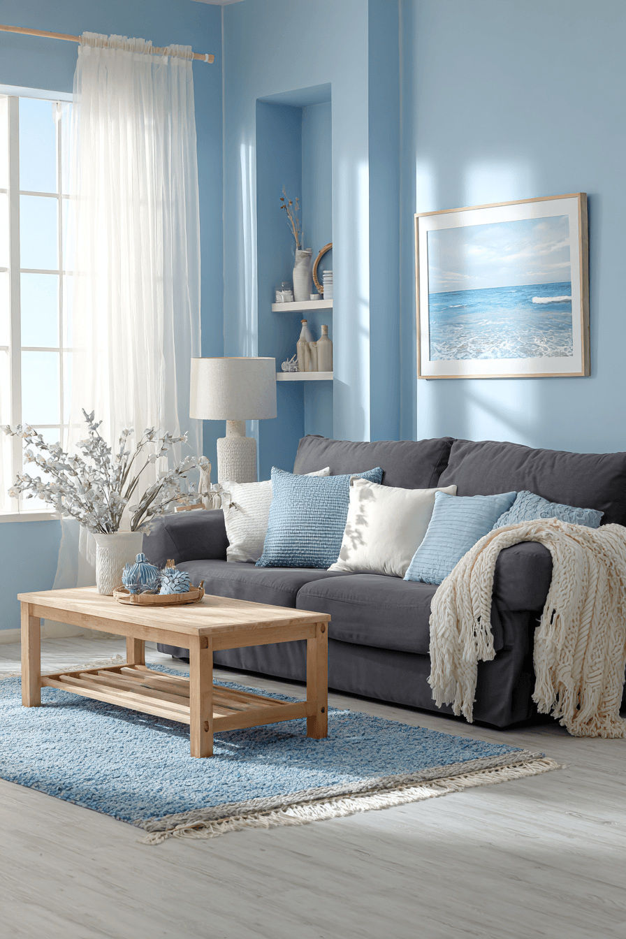 Coastal inspiration refreshes a dark grey sofa living room with light and airy charm. Soft blues and sandy neutrals balance the richness of the sofa. Natural fabrics add comfort and texture. The space feels breezy and relaxed. It’s perfect for a calming atmosphere. Bring coastal vibes into your home.