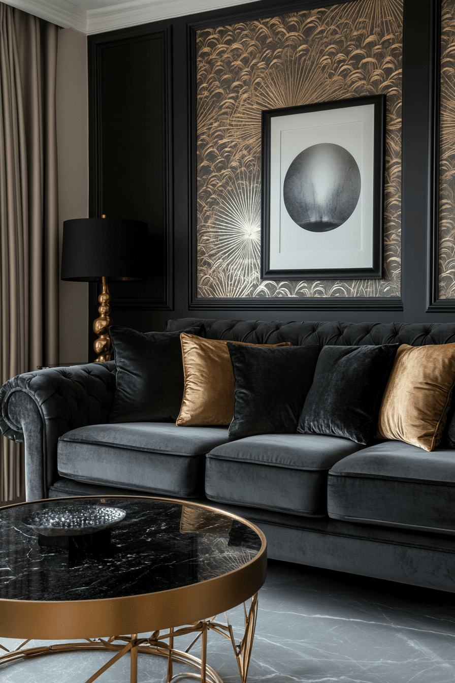 Art Deco elements bring glamour into a dark grey sofa living room with bold patterns and rich textures. Metallic finishes and velvet details add depth. The sofa anchors the design among striking accents. The space feels luxurious yet inviting. Every detail feels curated. Add timeless glamour to your space.