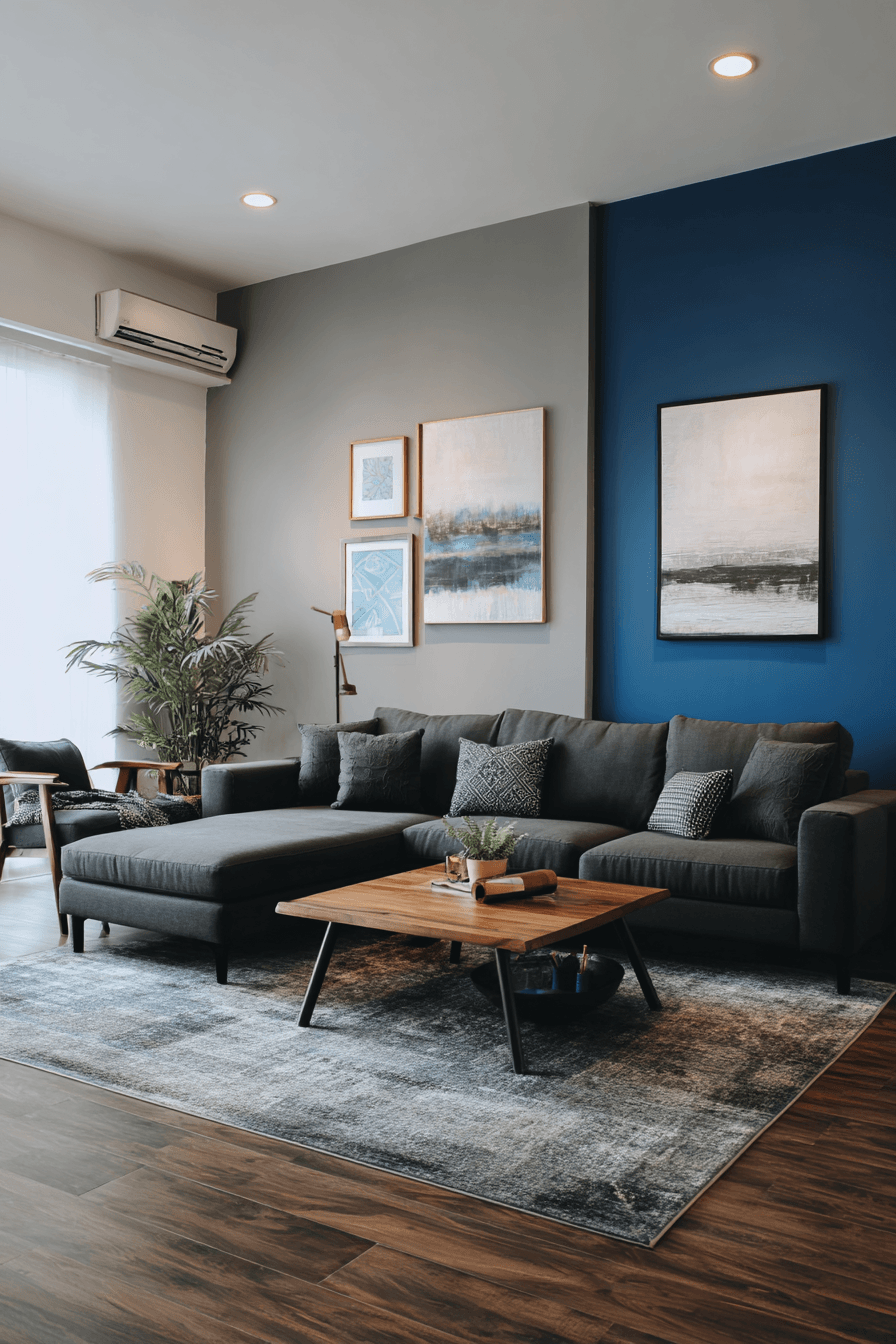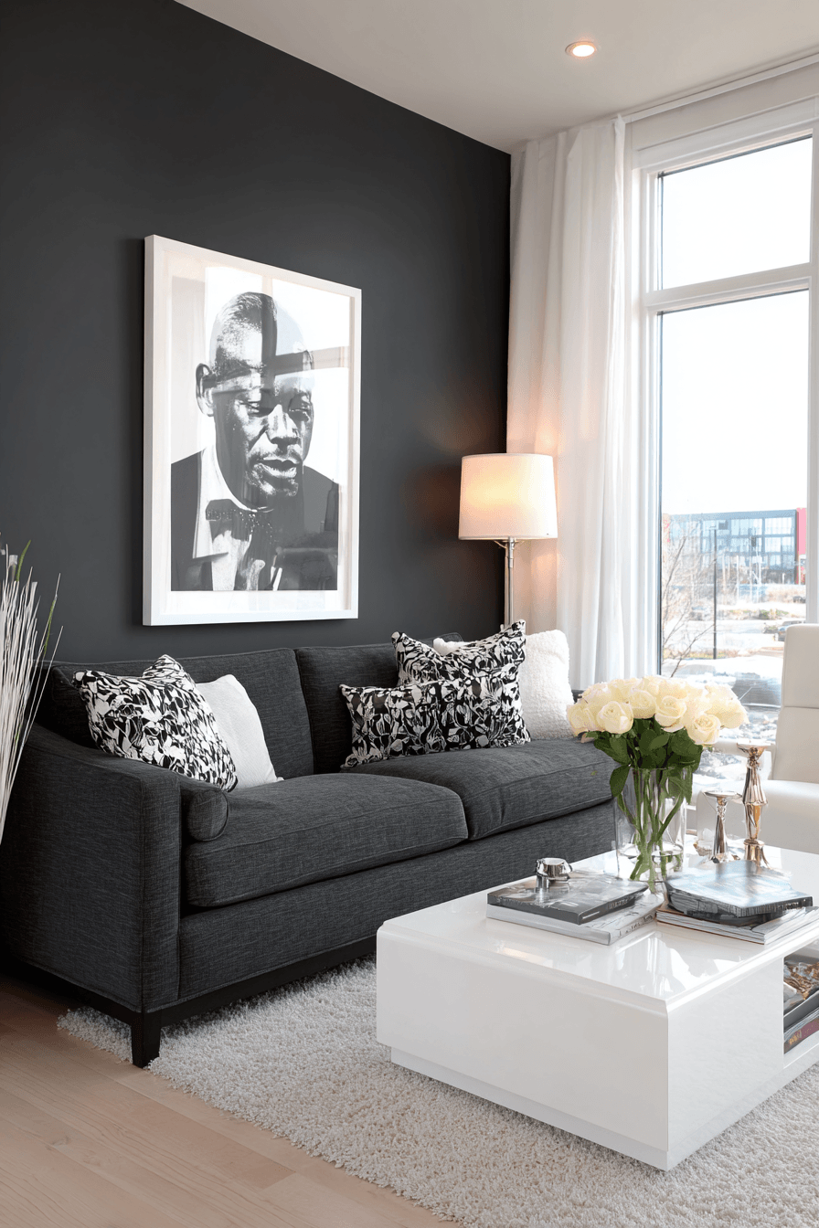 Contemporary contrast gives a dark grey sofa living room a bold and structured feel. Bright walls and dark accents create balance. Sleek furniture enhances the modern look. The design feels sharp and inviting. Every element feels intentional. Embrace contemporary style.
