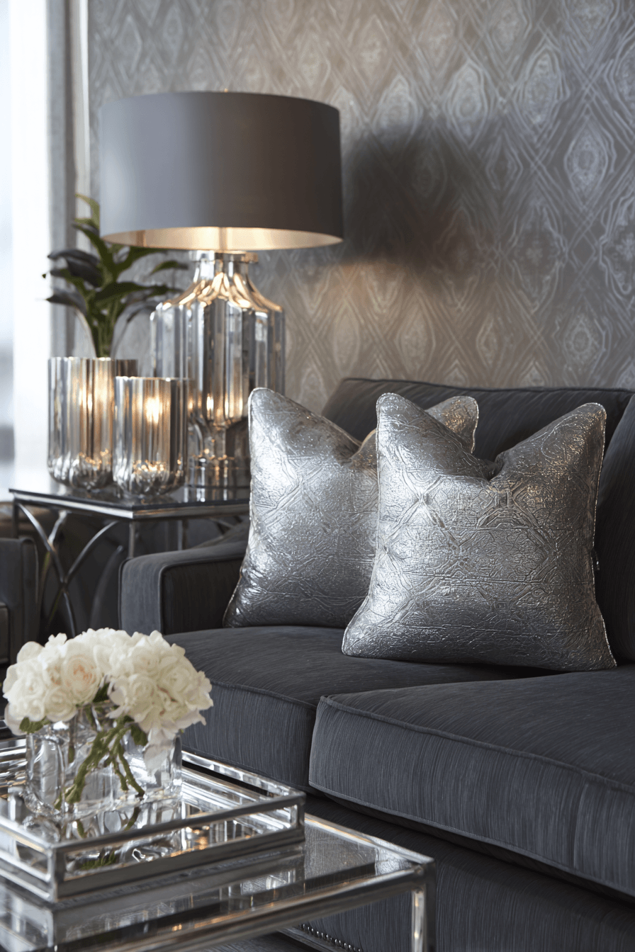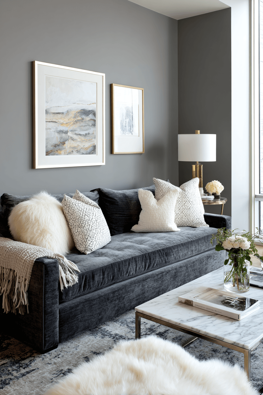 Metallic finishes elevate a dark grey sofa living room with shine and sophistication. Reflective surfaces add light and dimension. The sofa pairs beautifully with these accents. Minimal decor keeps the look balanced. The space feels sleek and refined. Add sparkle to your design.