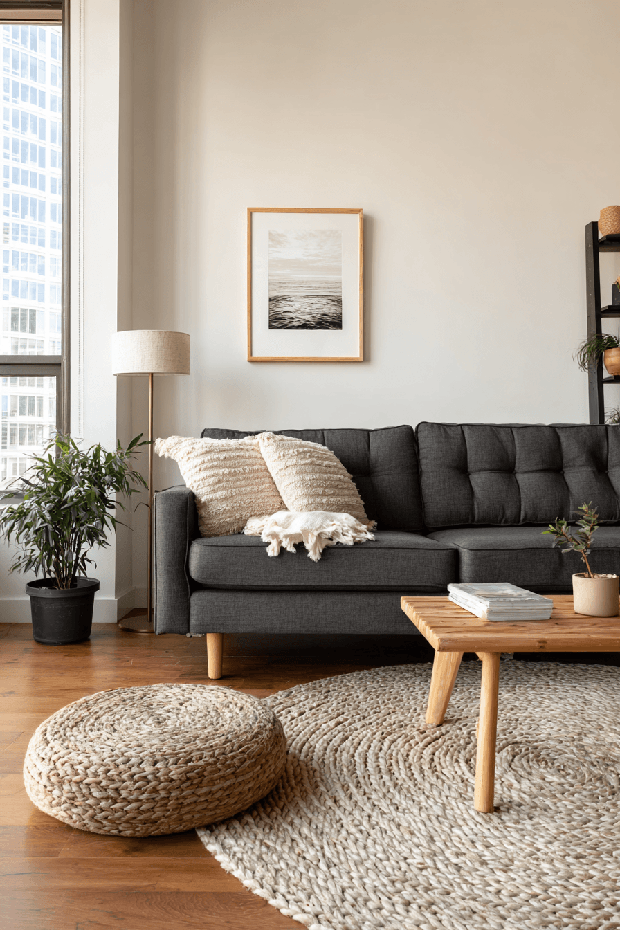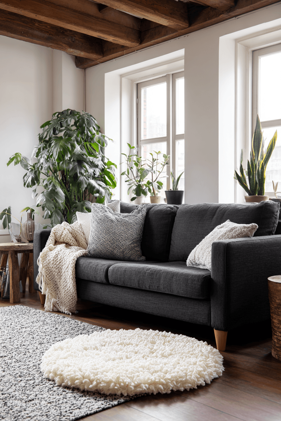A Scandinavian-inspired layout transforms a dark grey sofa living room into a cozy, functional retreat. Pale woods and bright walls keep the space feeling open. The sofa adds grounding depth to the design. Warm textiles like throws and rugs enhance comfort. Every detail feels purposeful and simple. Create a cozy Nordic-style living room.