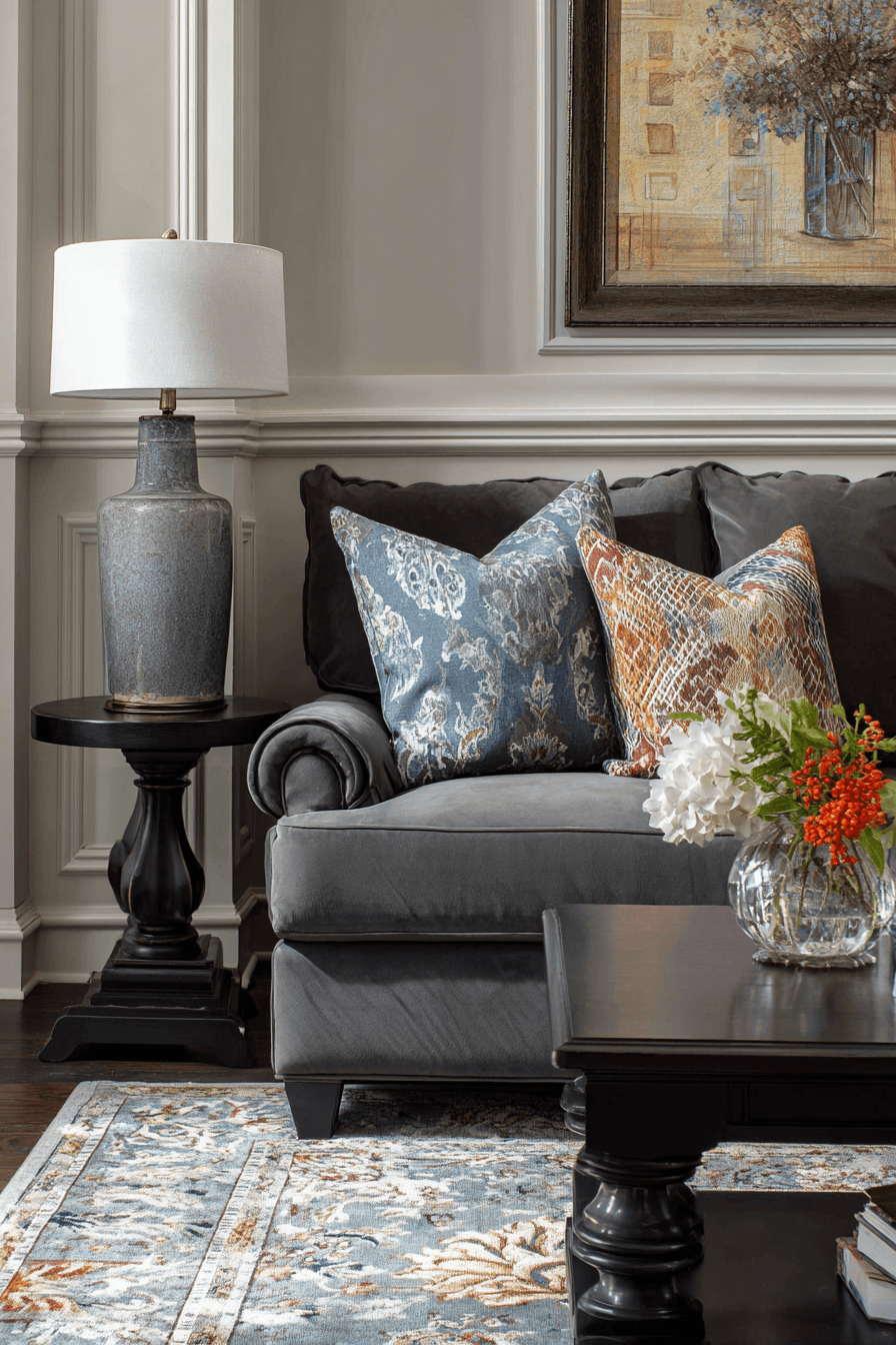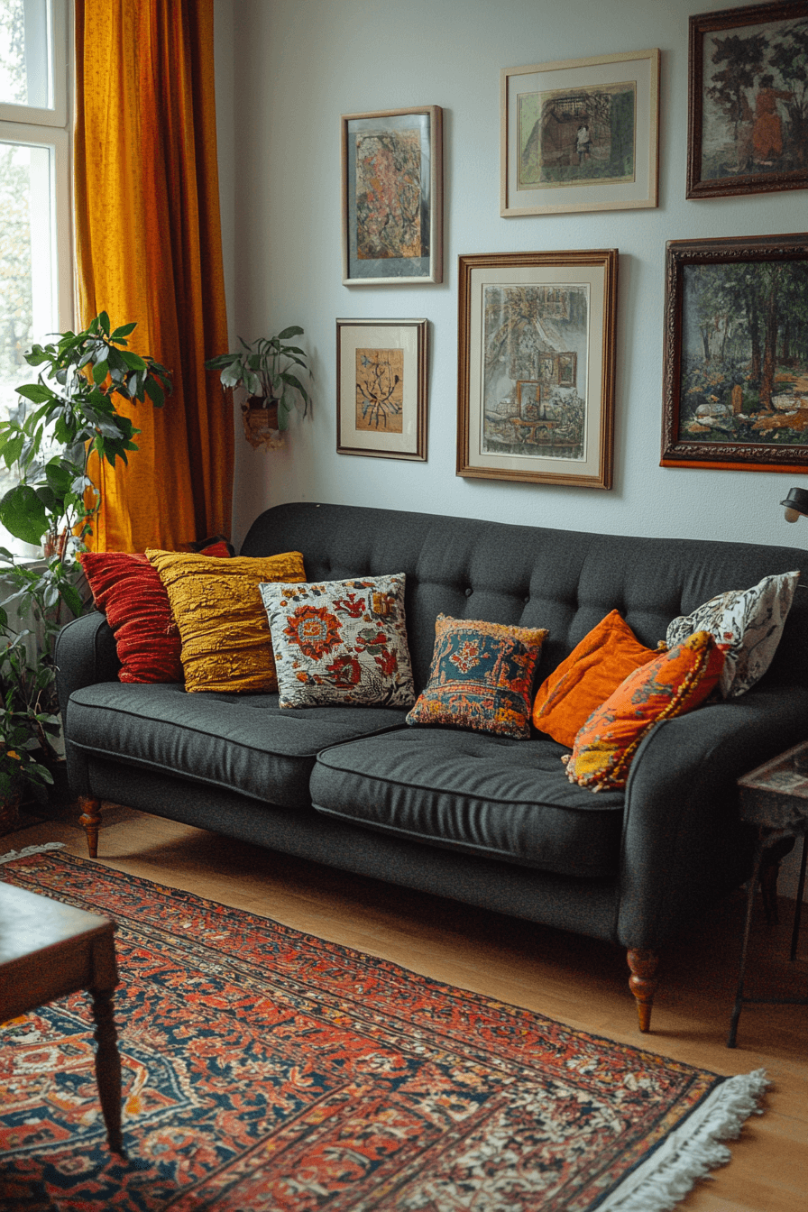 An eclectic mix of styles brings personality into a dark grey sofa living room. Vintage finds and modern accents create a curated feel. Bold patterns and unique decor add character. The space feels expressive and inviting. Every piece tells a story. Showcase your individuality.