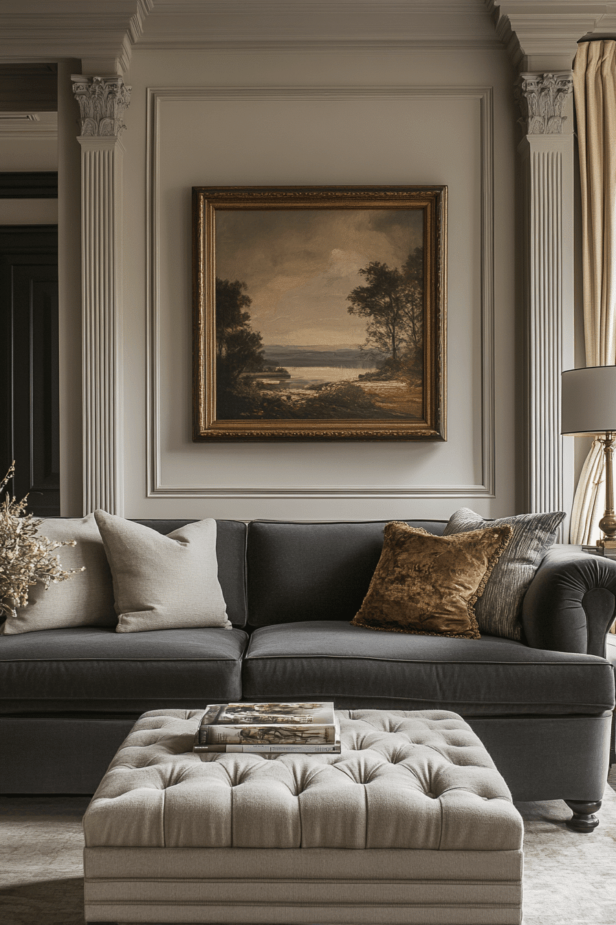 Neo-classical inspiration adds elegance to a dark grey sofa living room with refined details and structure. Decorative features create depth and sophistication. Modern touches keep the space balanced. The sofa blends seamlessly into the design. The room feels polished and timeless. Add classic elegance to your space.