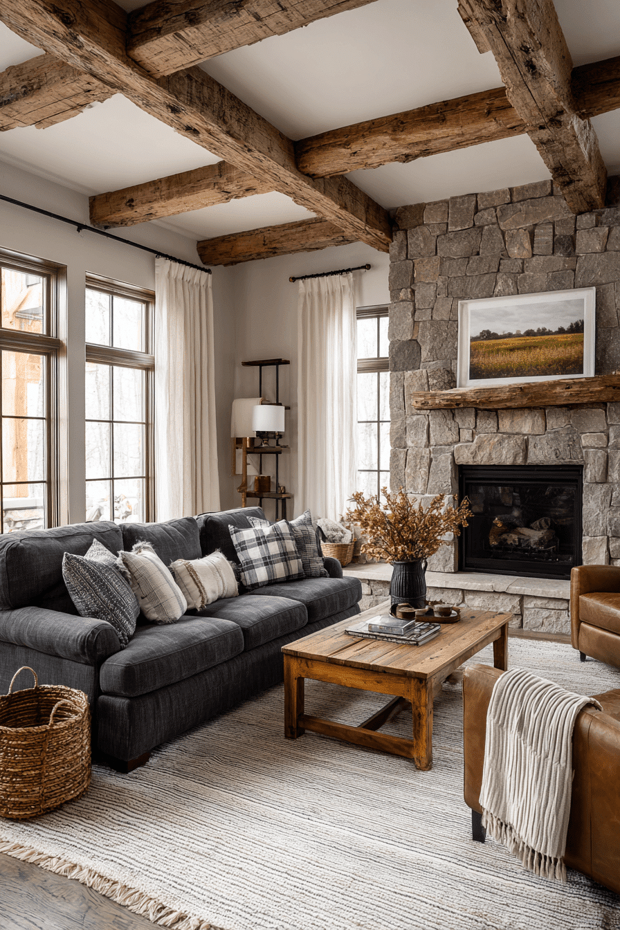 Rustic elements bring warmth into a dark grey sofa living room with natural textures and cozy layers. Wood finishes and stone accents add depth. Soft fabrics enhance comfort. The grey sofa balances the warmth beautifully. The space feels grounded and inviting. Create a rustic-inspired retreat.