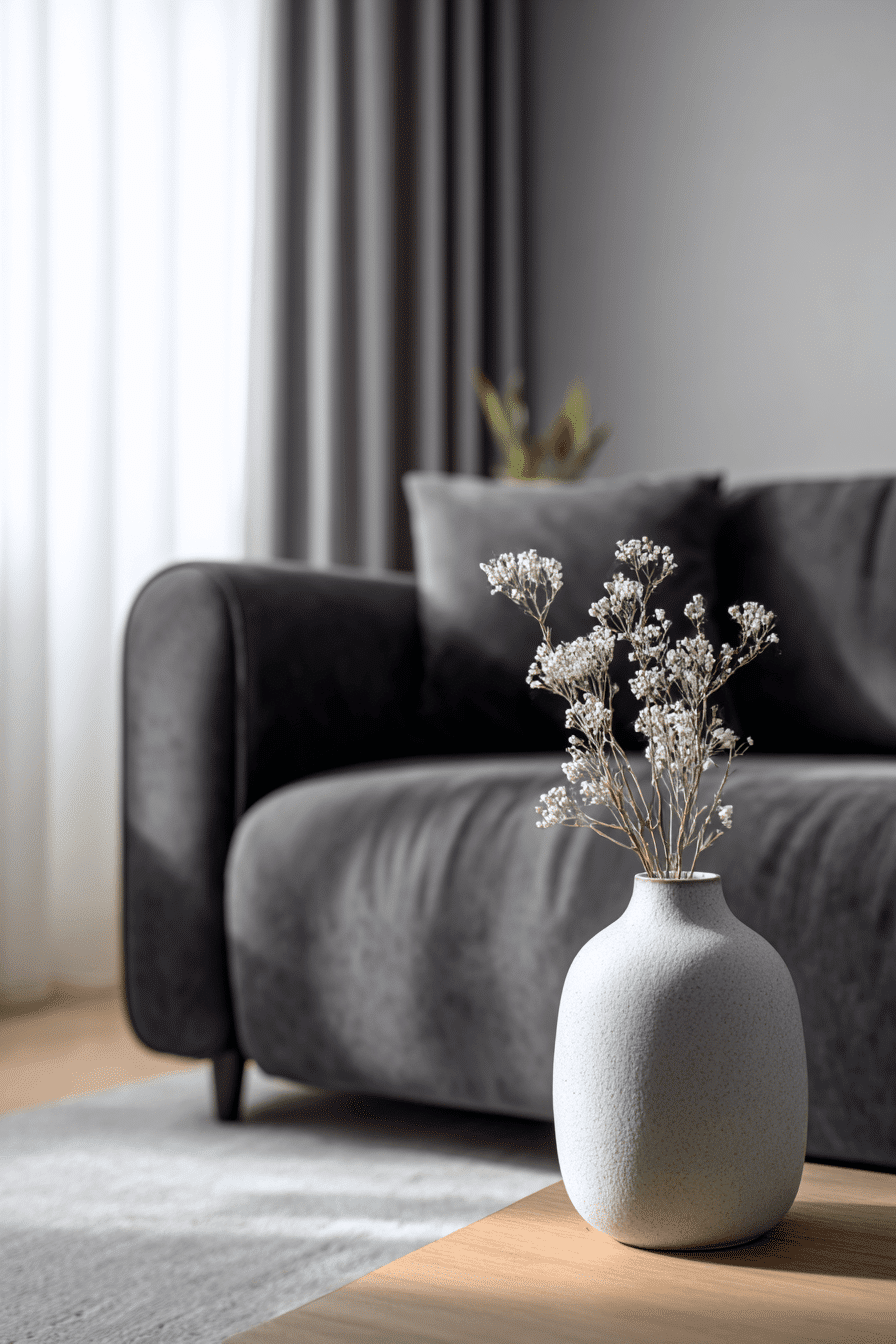 Minimalist maximalist styling creates a dark grey sofa living room with bold simplicity. Clean layouts highlight standout decor pieces. The sofa anchors the space. The design feels intentional and stylish. The balance feels effortless. Redefine minimalism with bold accents.