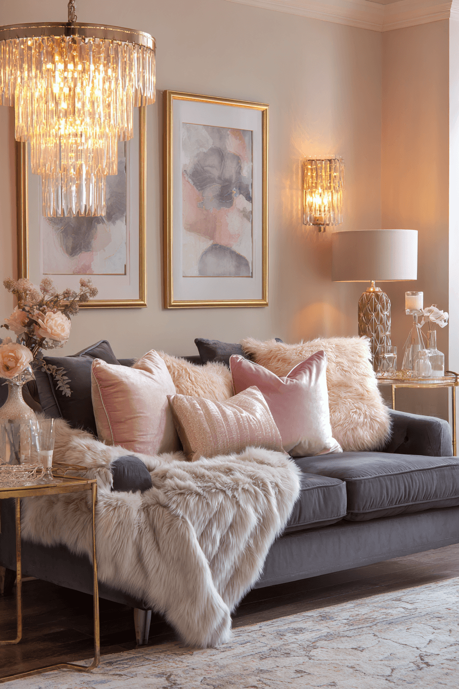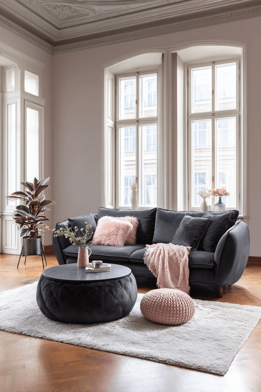 Soft textures and warm tones bring a romantic feel into a dark grey sofa living room. Flowing fabrics and plush cushions create a cozy glow. Gentle lighting enhances the inviting atmosphere. Subtle color accents soften the bold sofa. The space feels elegant and calm. Add a romantic touch to your home.