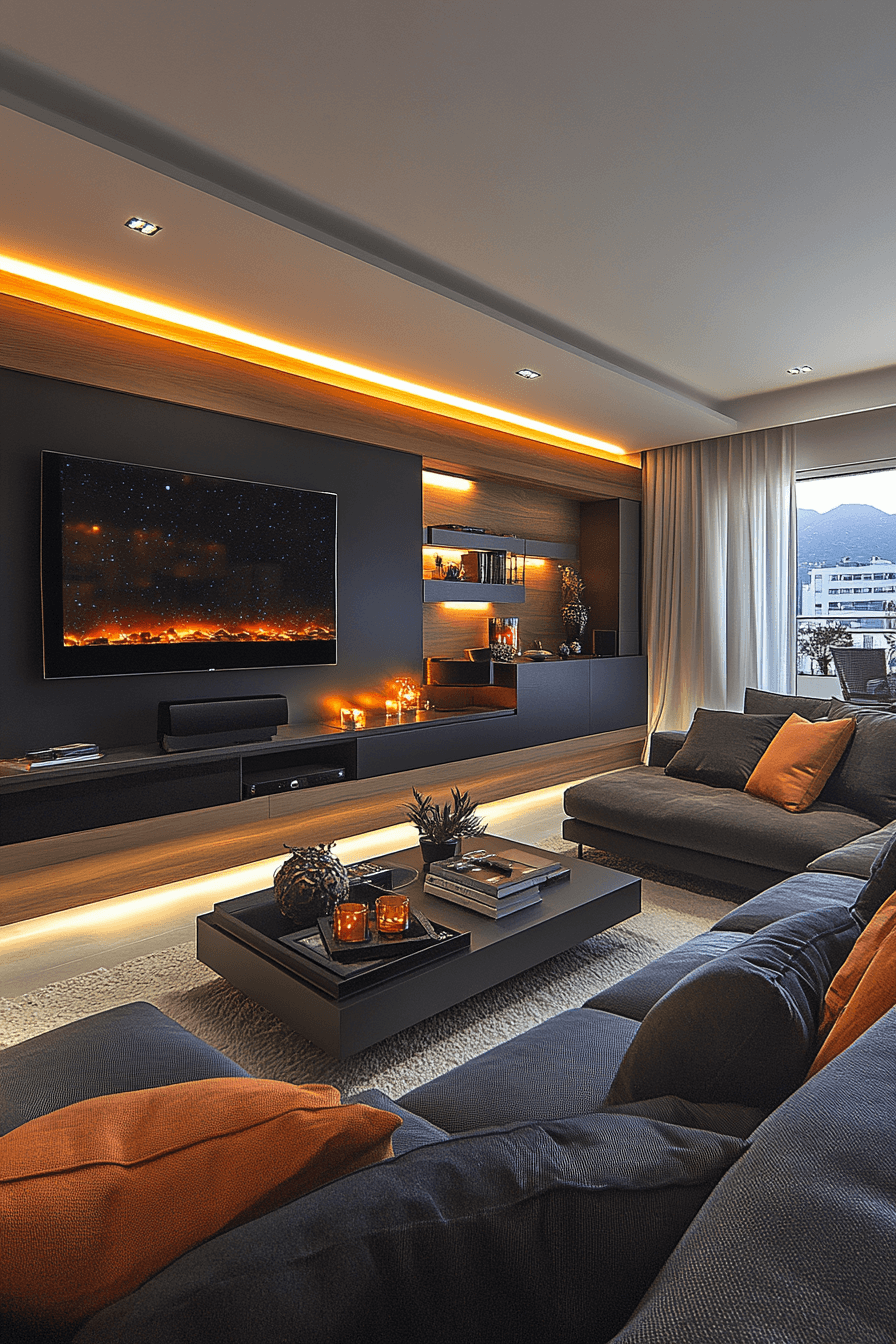 A futuristic approach gives a dark grey sofa living room a sleek and innovative feel. LED lighting and reflective surfaces add a modern edge. Bright accents balance the darker tones. Geometric shapes enhance the clean design. The space feels fresh and creative. Step into a futuristic living style.
