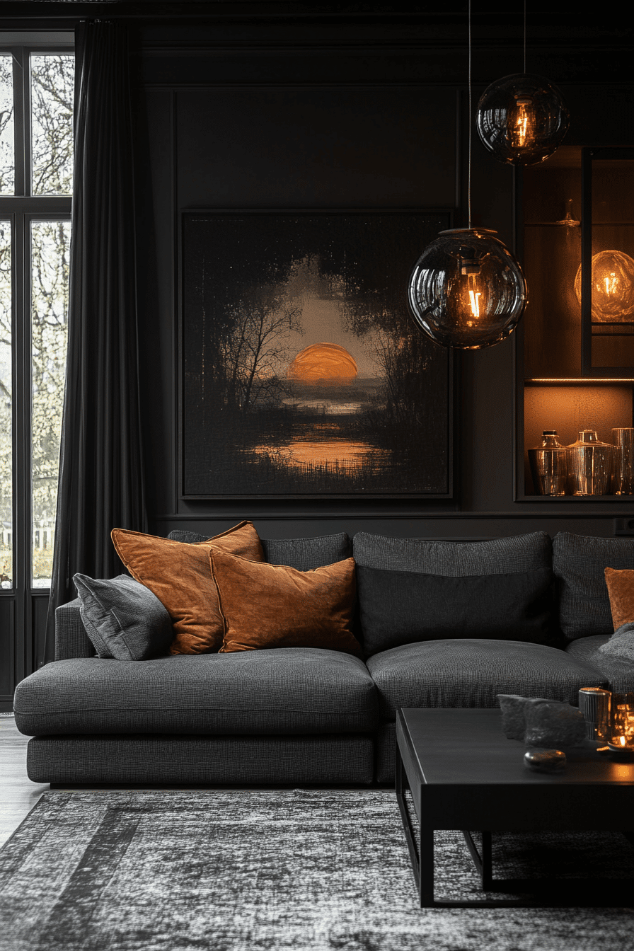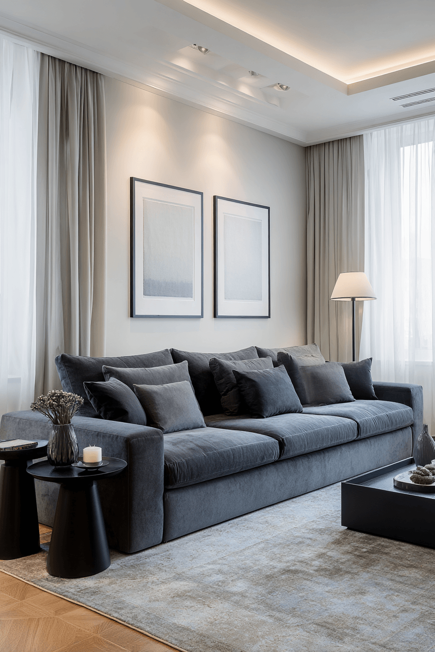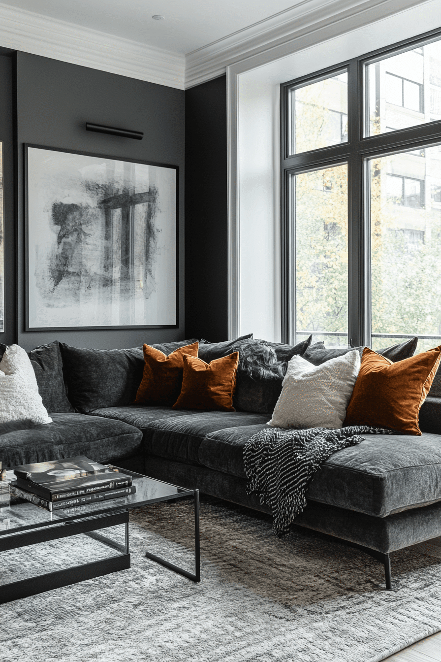 High contrast styling creates a dark grey sofa living room with bold visual impact. Light surfaces highlight the depth of the sofa. Pops of color add excitement. The design feels sharp and modern. It’s perfect for statement interiors. Reimagine your space with contrast.