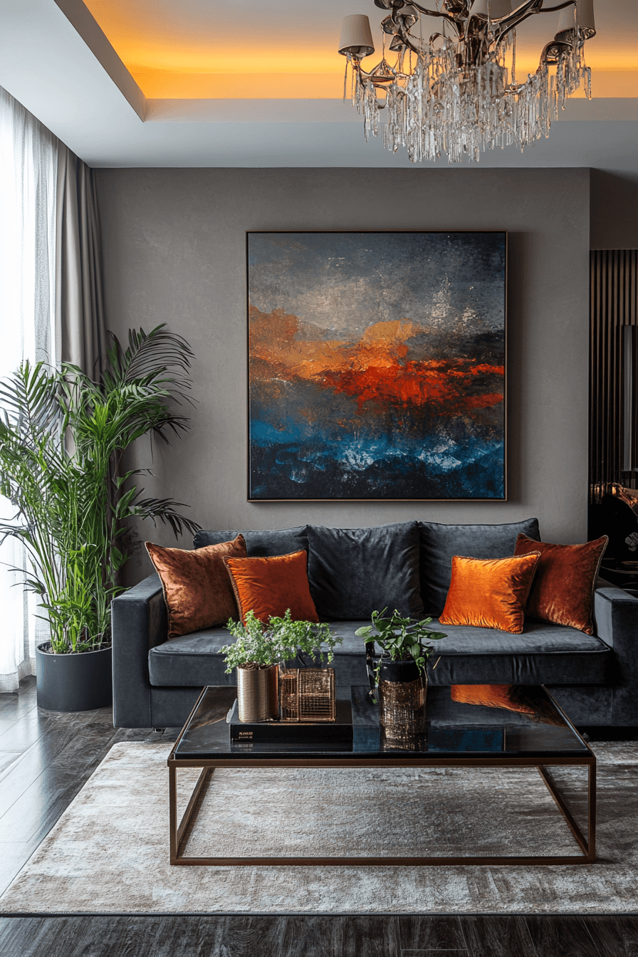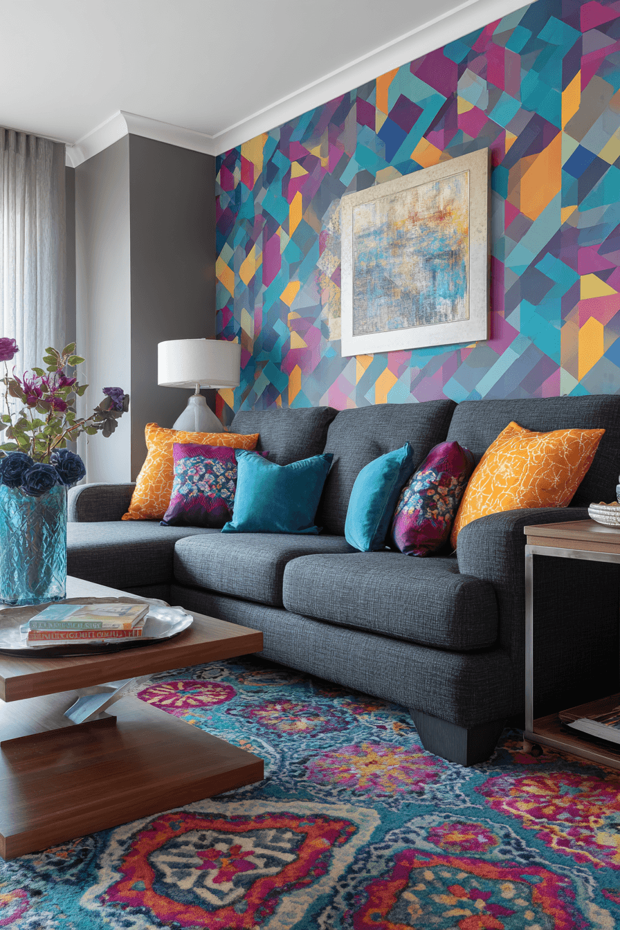 Bold color accents energize a dark grey sofa living room with creativity and personality. Bright artwork and statement decor bring the space to life. Patterns and sculptural elements add movement. The design feels lively yet balanced. The sofa anchors everything beautifully. Express your style with bold design.