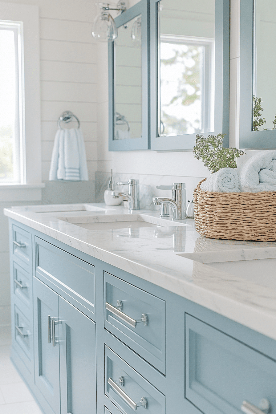 Coastal-inspired colors give a double sink bathroom vanity a breezy and relaxed feel. Soft blues and sandy tones create a refreshing palette. This double sink bathroom vanity often includes natural textures for added charm. The space feels light and open. It’s perfect for a calm environment. Add coastal style to your bathroom.