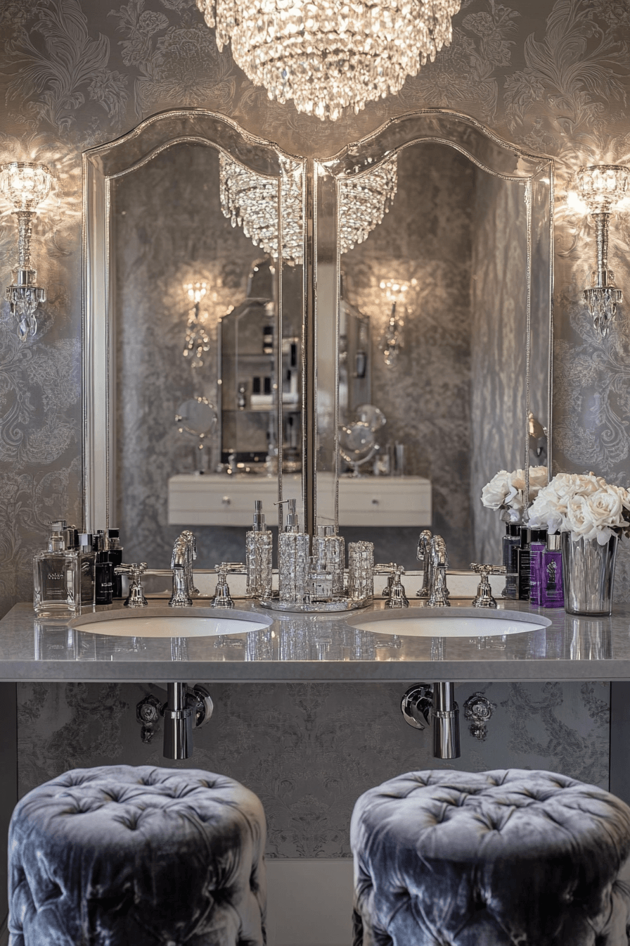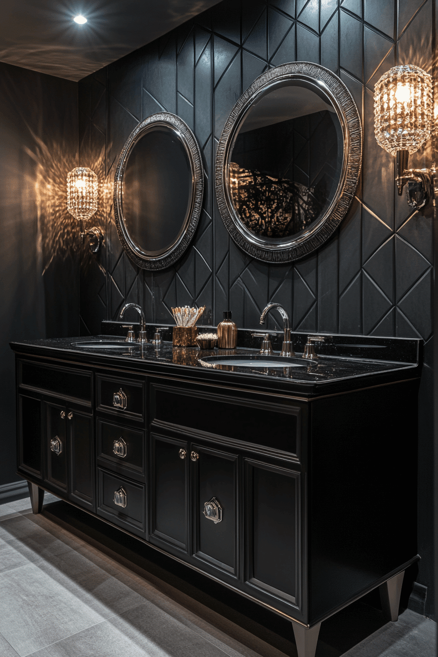 Art Deco influence brings bold elegance to a double sink bathroom vanity with geometric patterns and rich finishes. Metallic accents enhance the luxurious feel. This double sink bathroom vanity creates a striking and refined look. Statement details complete the design. The space feels glamorous and polished. Add timeless glamour to your bathroom.